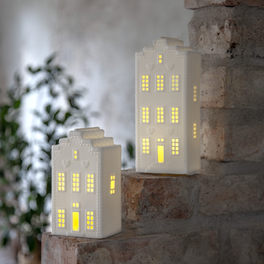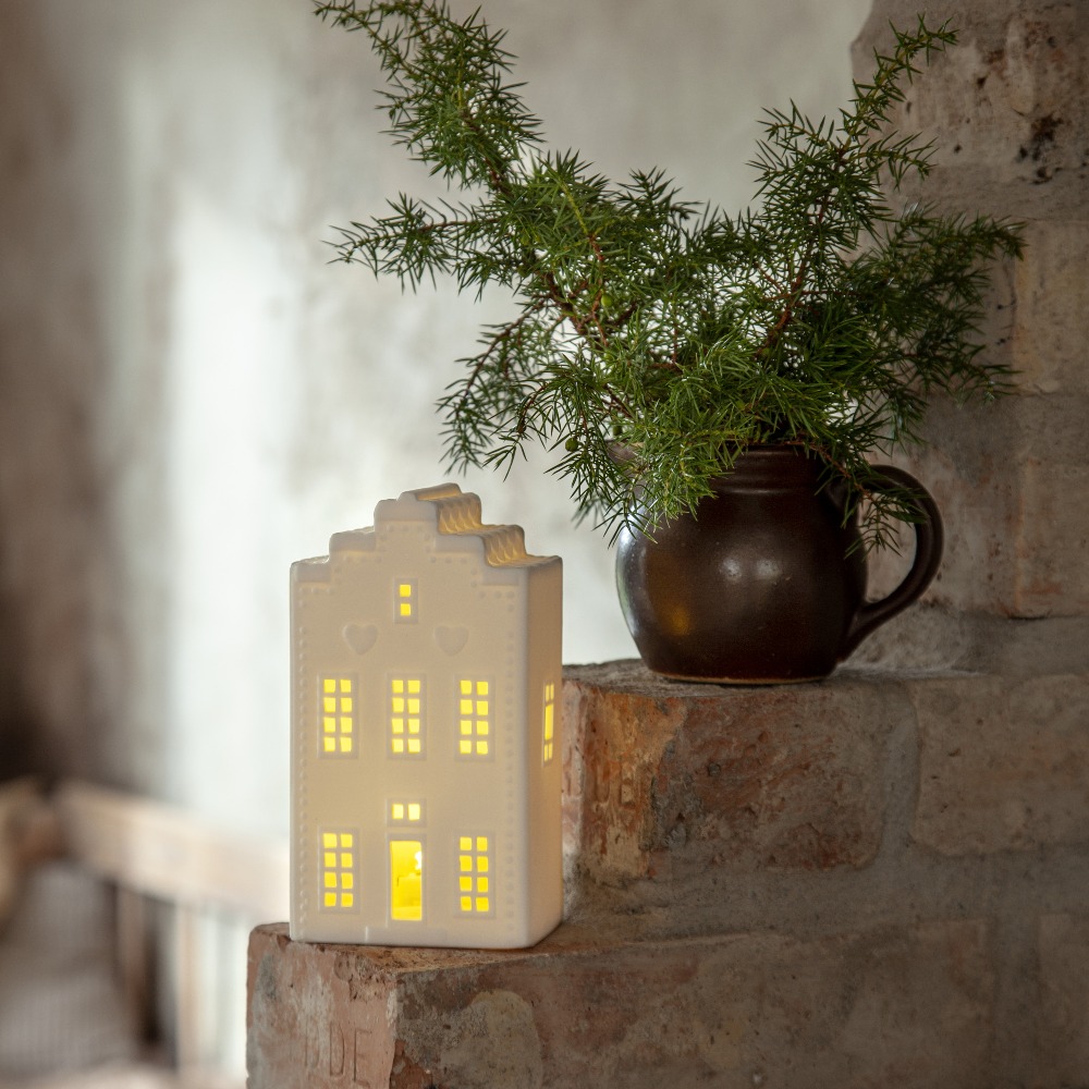Ceramiczna forma z delikatnymi detalami – ponadczasowy kształt domku w stylu kamienicy wnosi do wnętrza ciepło i charakter.
