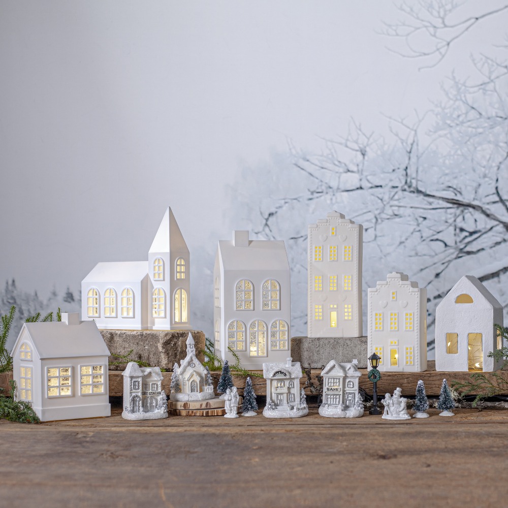 Wprowadź do swojego wnętrza nutę świątecznej nostalgii dzięki temu urokliwemu ceramicznemu domkowi z podświetleniem LED. Subtelna forma i białe wykończenie sprawiają, że dekoracja prezentuje się niezwykle elegancko, a ciepłe światło wydobywające się z okienek tworzy wyjątkowy, zimowy klimat. Dzięki zasilaniu bateryjnemu i funkcji timera, możesz cieszyć się magiczną atmosferą bez konieczności codziennej obsługi. Idealny na parapet, komodę lub do stworzenia świątecznego miasteczka z innymi domkami.