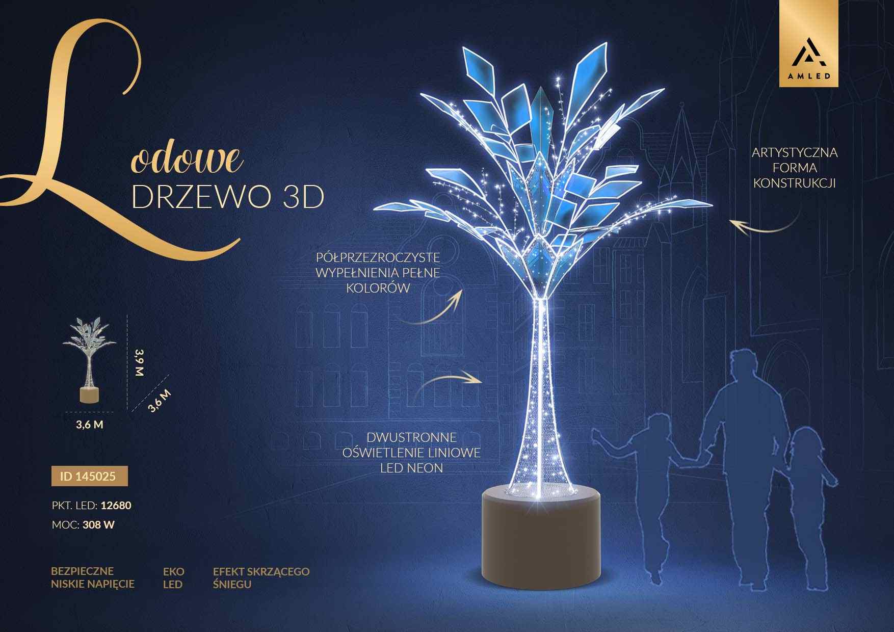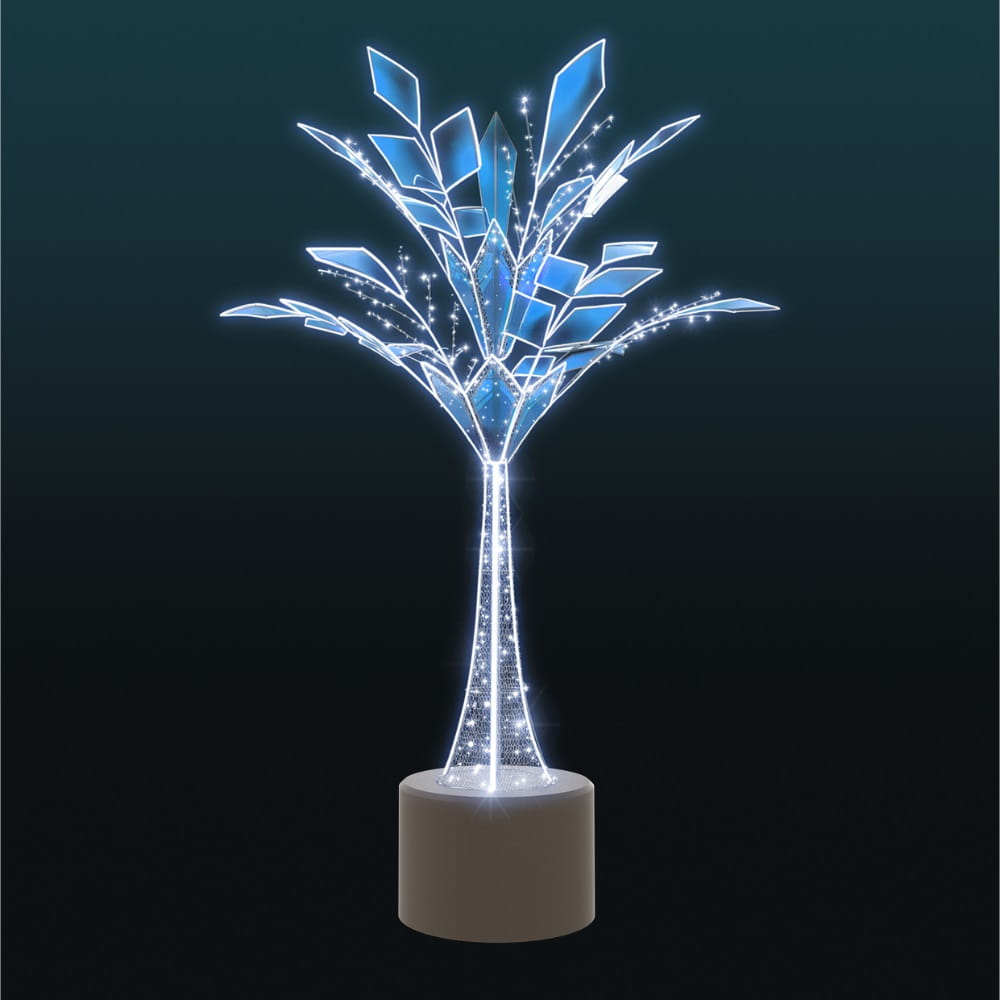 „Lodowe Drzewo 3D” to zachwycająca instalacja, która łączy nowoczesny design z efektowną iluminacją LED. Jej dynamiczna forma przypominająca zamarznięte gałęzie, zbudowana jest z lekko prześwitujących paneli o intensywnych, chłodnych barwach. Dekoracja przyciąga uwagę z daleka, zamieniając każdą przestrzeń miejską w zimowy krajobraz niczym z baśni o Królowej Śniegu.