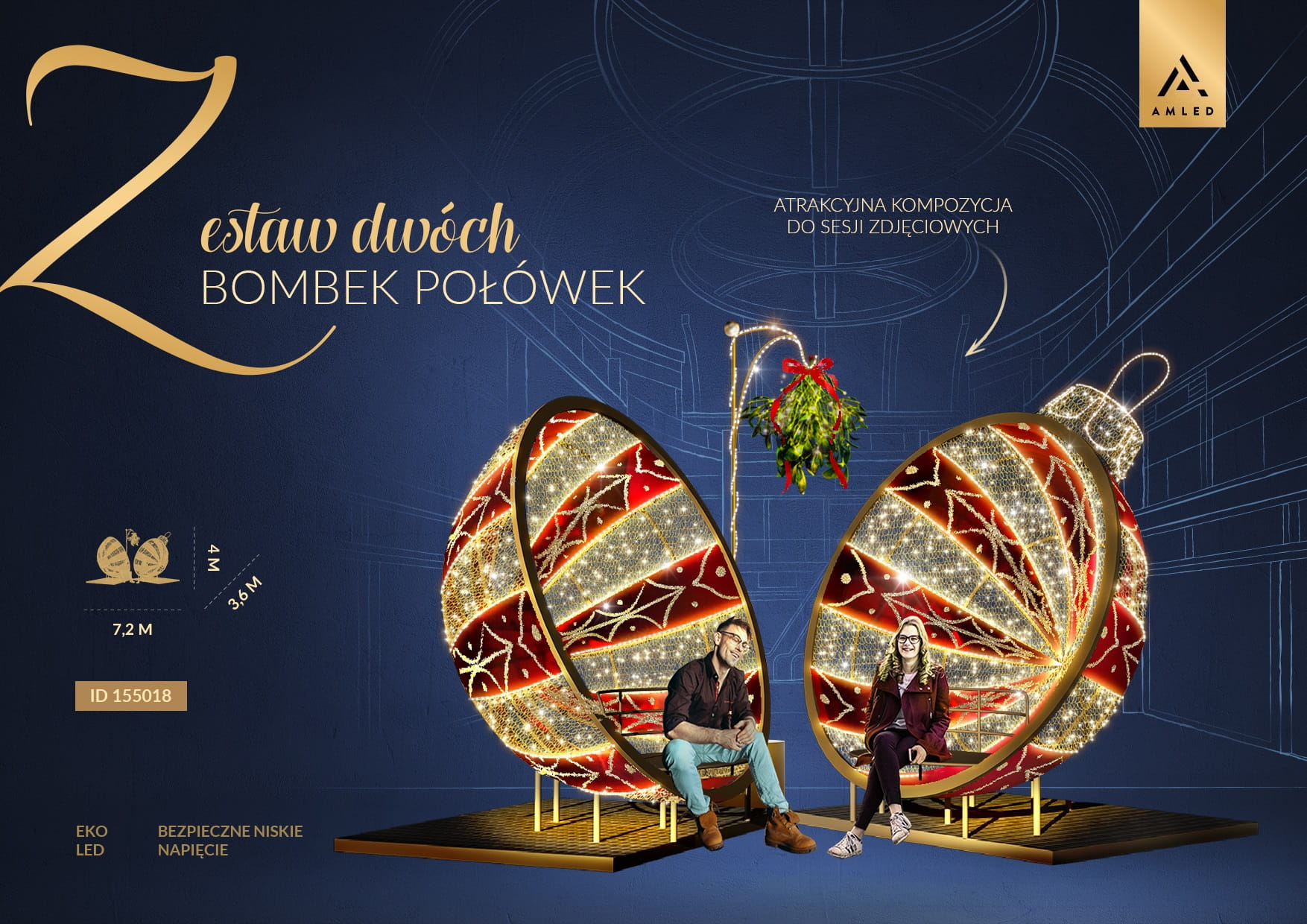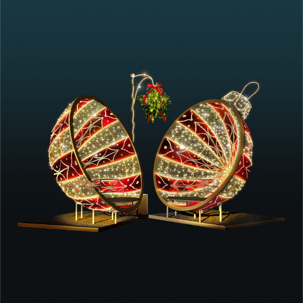 Zestaw dwóch Bombek Połówek 3D z siedziskami to efektowna iluminacja świąteczna, która zachwyca unikalnym designem i przyciąga wzrok zarówno w dzień, jak i po zmroku. Dodatkowo jemioła umieszczona nad siedziskami podkreśla świąteczny i romantyczny charakter dekoracji.
