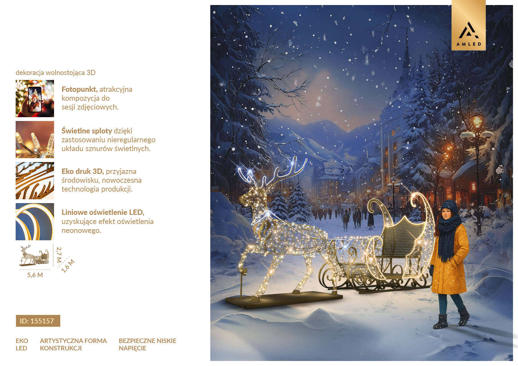 Artystyczna forma i bezpieczeństwo – przestrzenna kompozycja o wysokości 2,7 m i długości 5,6 m tworzy wyjątkowy fotopunkt dla mieszkańców i turystów. Dekoracja pracuje w systemie niskonapięciowym, co zapewnia bezpieczeństwo użytkowania w miejscach publicznych.
