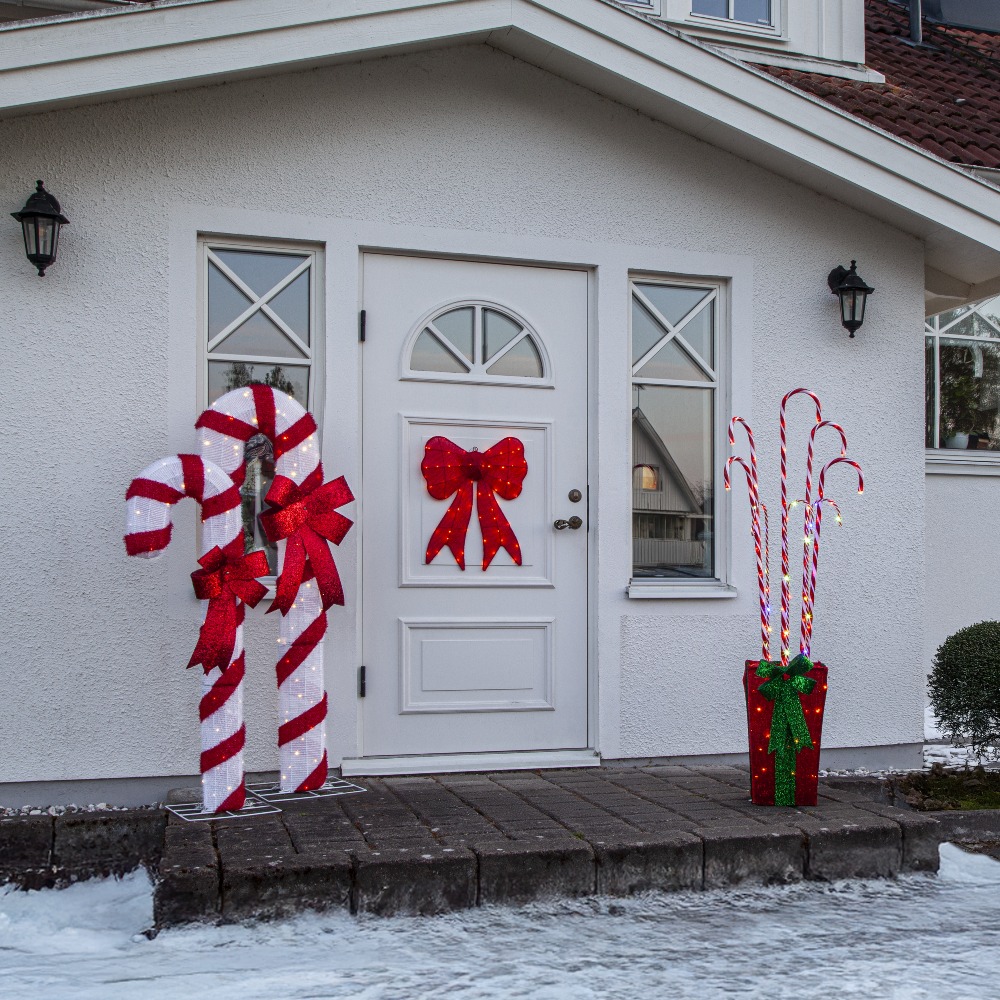Dekoracyjna laska cukrowa o wysokości 120 cm to efektowny element świątecznego wystroju, który przyciąga wzrok intensywnymi barwami i przyjemnym blaskiem. Utrzymana w klasycznej kolorystyce bieli i czerwieni, ozdobiona połyskującą kokardą, tworzy radosny i elegancki akcent zarówno we wnętrzu, jak i na zewnątrz. Ciepłe światło LED podkreśla kontury dekoracji, wprowadzając do otoczenia świąteczną atmosferę. Dla zachowania materiału w dobrym stanie, zaleca się ekspozycję w miejscu osłoniętym przed bezpośrednimi opadami.