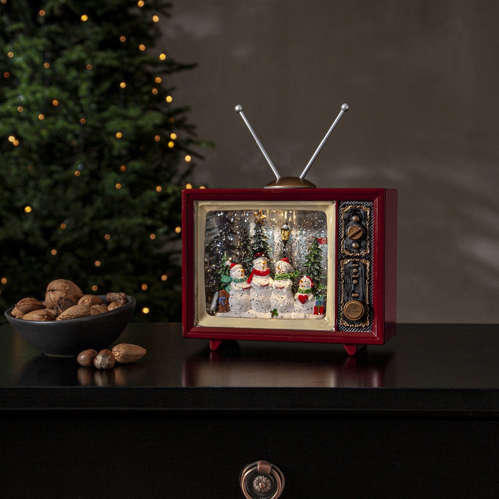 Wprowadź do swojego wnętrza odrobinę nostalgii i świątecznej magii dzięki tej dekoracji w kształcie retro telewizora. W ekranie znajduje się urocza scena przedstawiająca rodzinę bałwanów w zimowym krajobrazie – z ośnieżonymi choinkami i latarnią uliczną w tle. Całość otacza brokatowy płyn, który po włączeniu zaczyna wirować, tworząc efekt wirującego śniegu. Ciepłe światło LED rozświetla dekorację i buduje przytulną atmosferę.