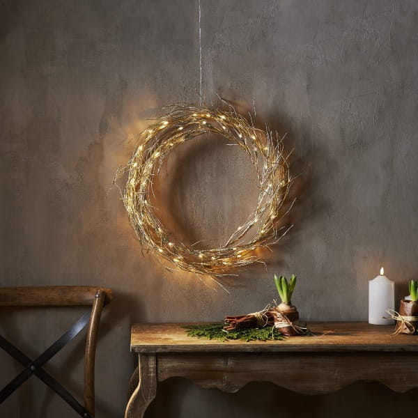 Fantastyczny wieniec o średnicy 45 cm to elegancka dekoracja, która z powodzeniem ozdobi Twoje wnętrze, nadając mu wyjątkowego uroku. Jego lekko złota, podwójna konstrukcja zapewnia pełne i efektowne wrażenie, tworząc nastrojową atmosferę. Wyposażony w 50 małych punktów LED, wieniec emituje subtelne, ciepłe światło, które rozświetla przestrzeń. Zasilany z sieci, gwarantuje stabilne oświetlenie przez cały okres świąteczny.
