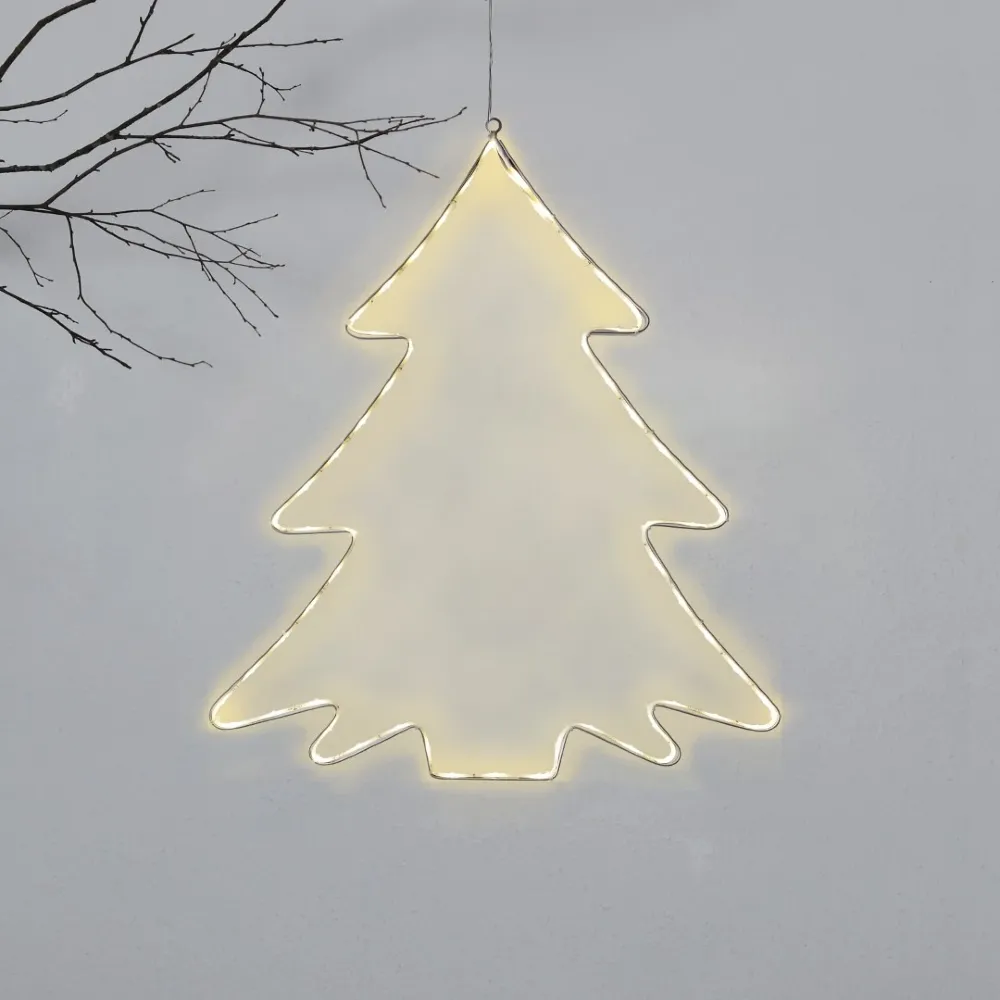 Dekoracja wisząca w formie choinki o wysokości 50 cm to elegancka ozdoba, która doskonale nadaje się do wnętrz oraz przestrzeni zewnętrznych. Wyposażona w 60 diody LED, emitujące ciepłe światło, tworzy przytulną, świąteczną atmosferę, subtelnie podkreślając kształt choinki i nadając jej wyjątkowy wygląd. Idealna do zawieszenia na ścianie, drzwiach lub oknie, doskonale wpasowuje się w każdą świąteczną aranżację.
