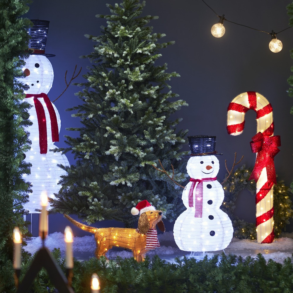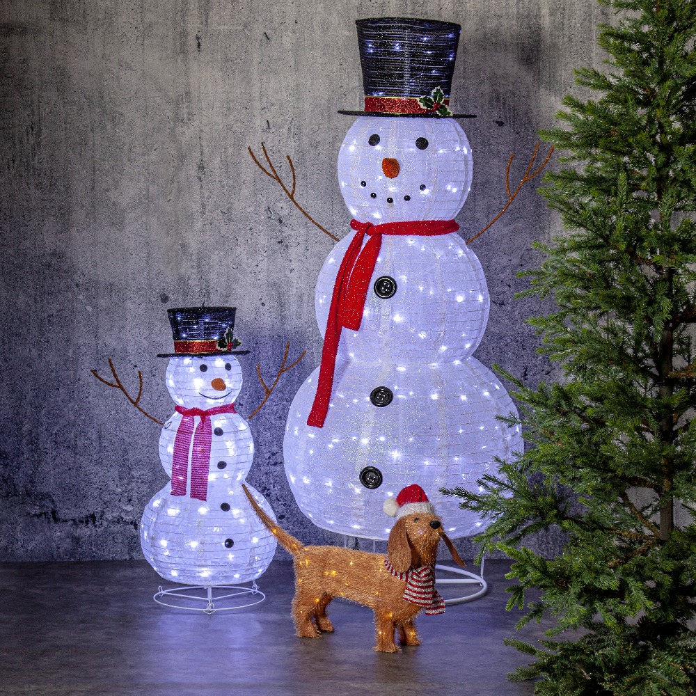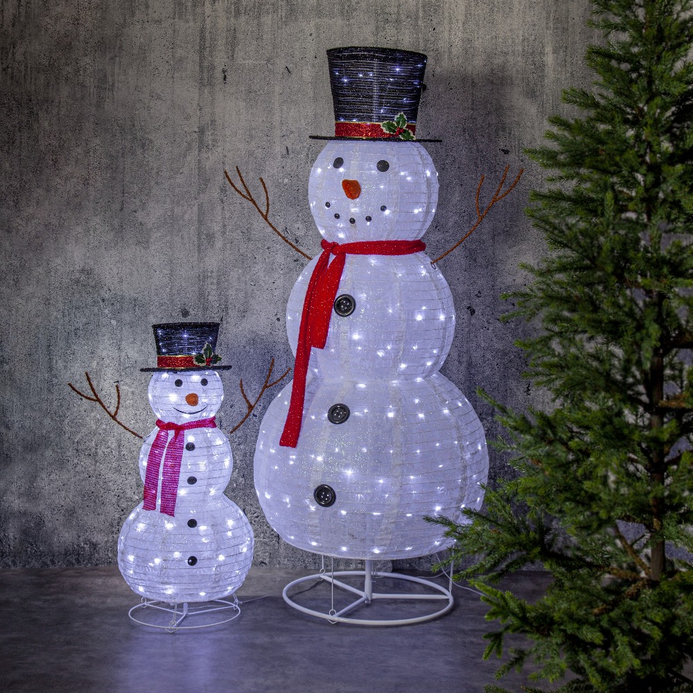Zabawna dekoracja świąteczna w formie uśmiechniętego bałwanka o wysokości 90 cm to doskonały akcent, który rozświetli zimowe aranżacje zarówno na zewnątrz, jak i wewnątrz domu. Bałwanek ubrany jest w czarny kapelusz ozdobiony gałązkami, czerwony szalik oraz posiada patykowe ramiona i czarne guziki na tułowiu. Dzięki białym diodom LED dekoracja emituje przyjemne światło, wprowadzając ciepłą i radosną atmosferę. Aby zachować tkaninę w dobrym stanie, zaleca się umieszczenie jej w osłoniętym miejscu, np. pod zadaszeniem.