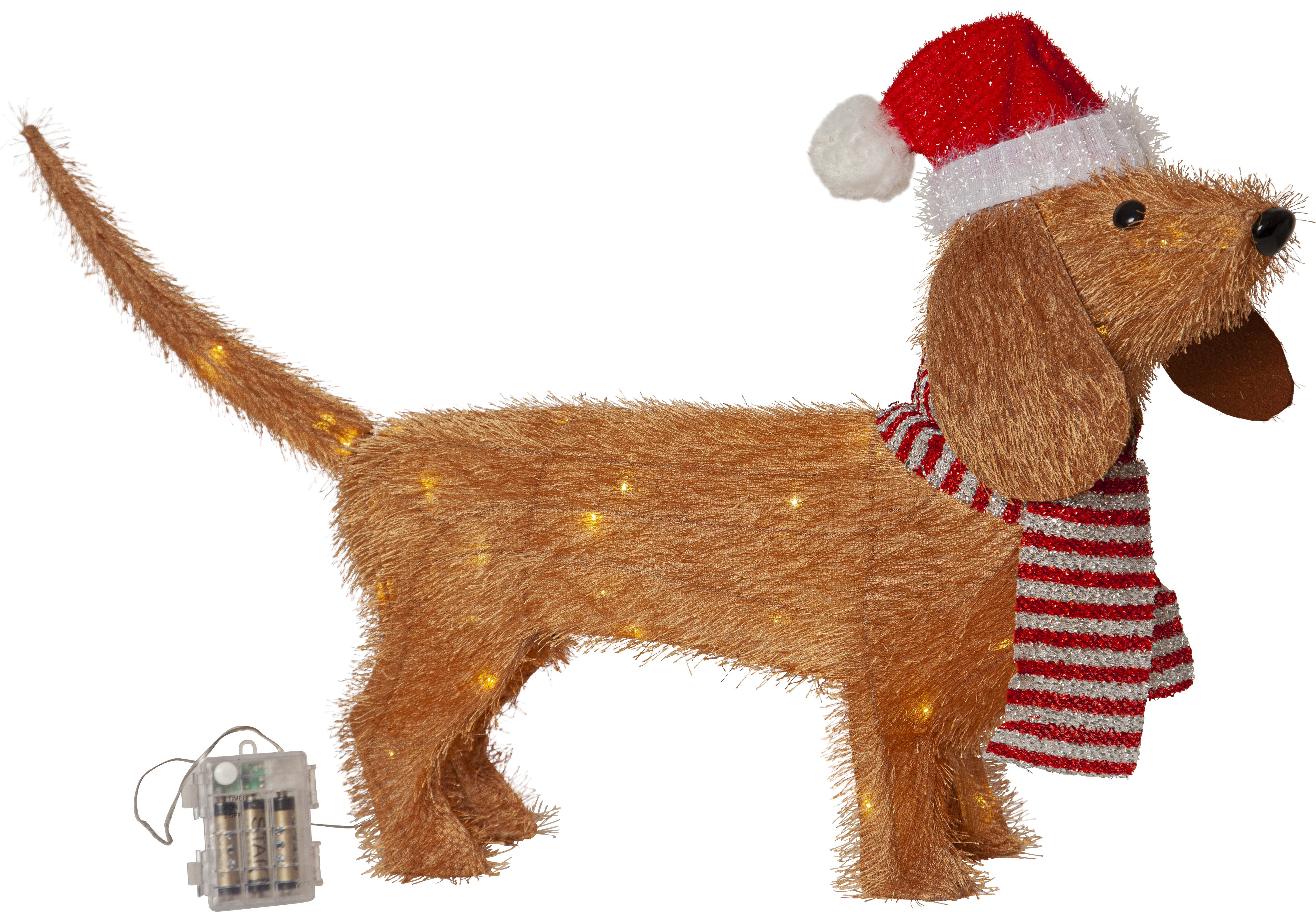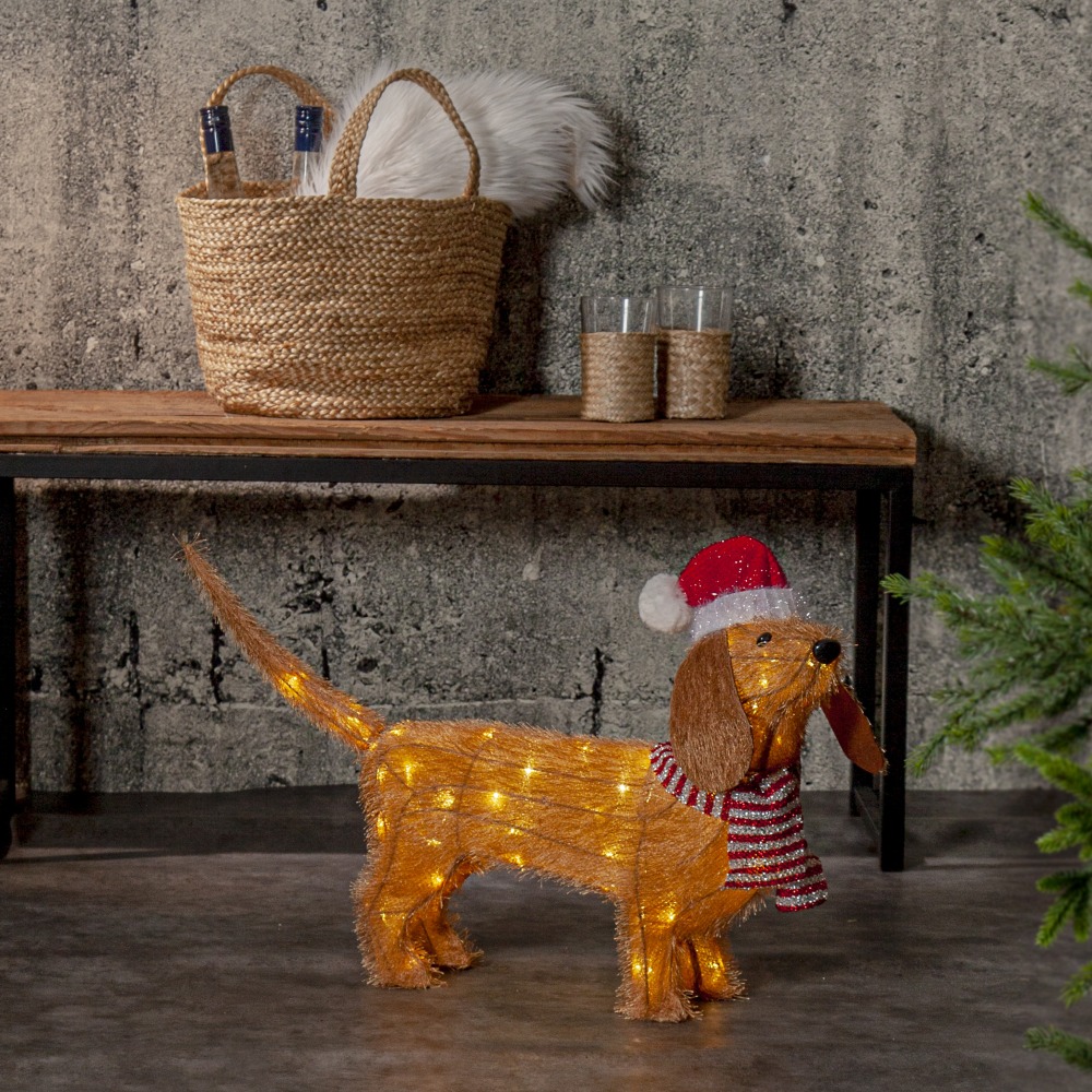 Dekoracja świetlna LED w kształcie psa z czapką świąteczną i pasiastym szalikiem, ustawiona na podłodze we wnętrzu. Ciepłe punkty światła podkreślają sylwetkę i strukturę materiału.