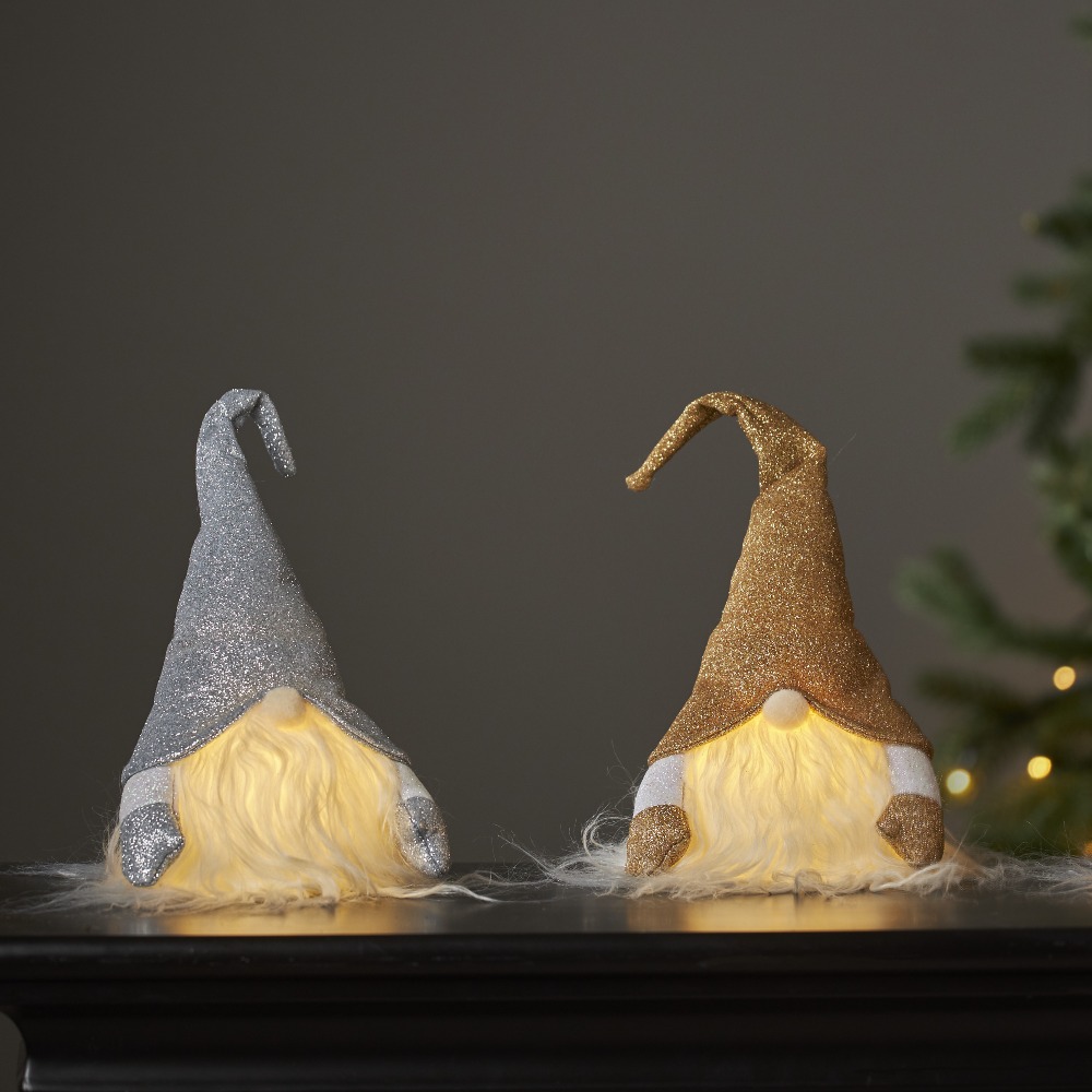 Złoty i srebrny skrzat LED z brokatowymi czapkami oraz podświetlanymi brodami, stojące obok siebie na stole na tle choinki.