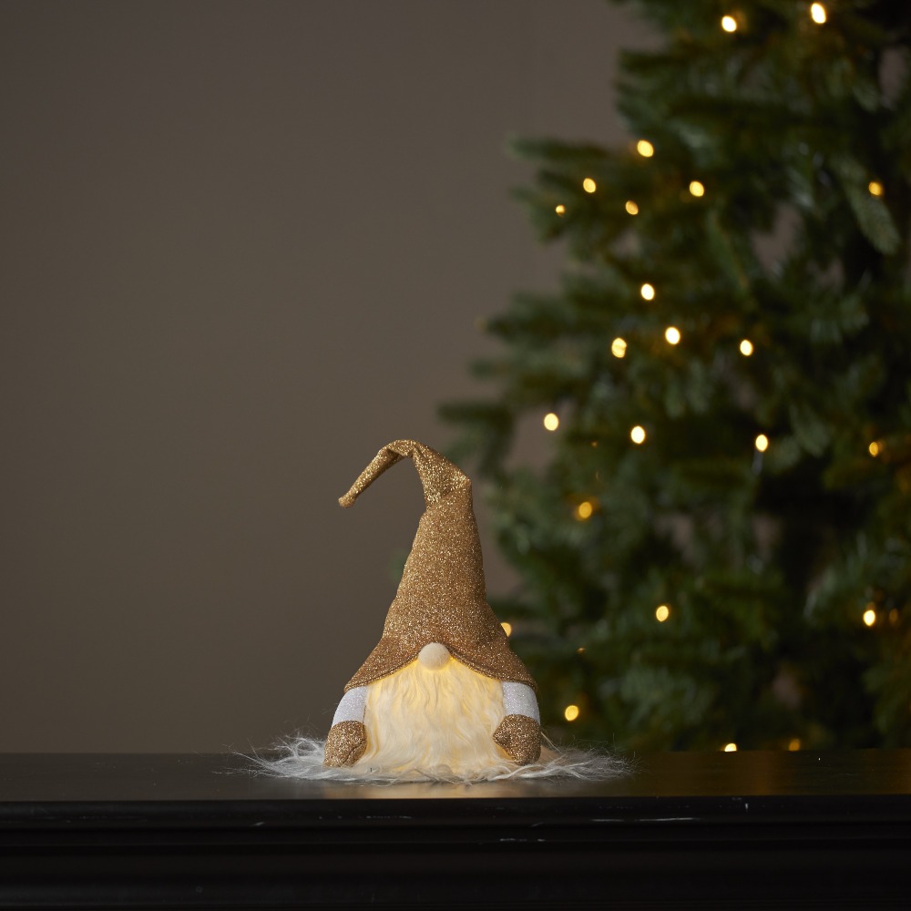 Złoty skrzat LED z wysoką brokatową czapką i delikatnie podświetlaną brodą, pokazany na jasnym tle.