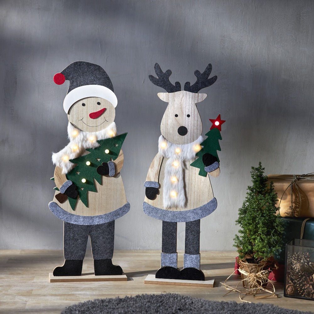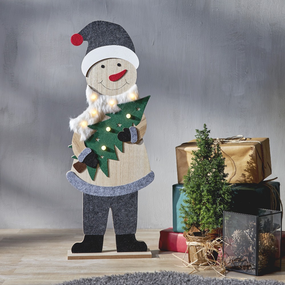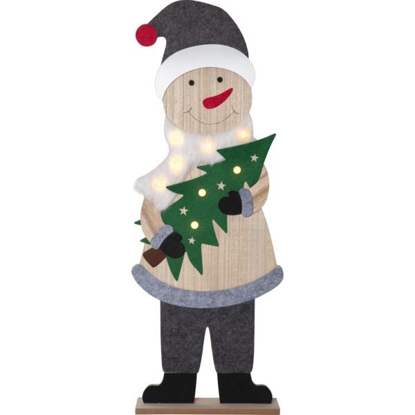 Wprowadź do swojego wnętrza radosną atmosferę zimowych świąt dzięki tej uroczej dekoracji w postaci drewnianego bałwanka o wysokości 80 cm. Ubrany w zimowy strój z czapką i szalikiem, zachwyca przyjaznym wyglądem i świątecznym charakterem. W rękach trzyma choinkę ozdobioną złotymi gwiazdkami, a całość rozświetlana jest ciepłymi światłami LED, które tworzą nastrojową i przytulną aurę. Dekoracja działa na baterie i posiada funkcję timera, co czyni ją wygodną i praktyczną w codziennym użytkowaniu.