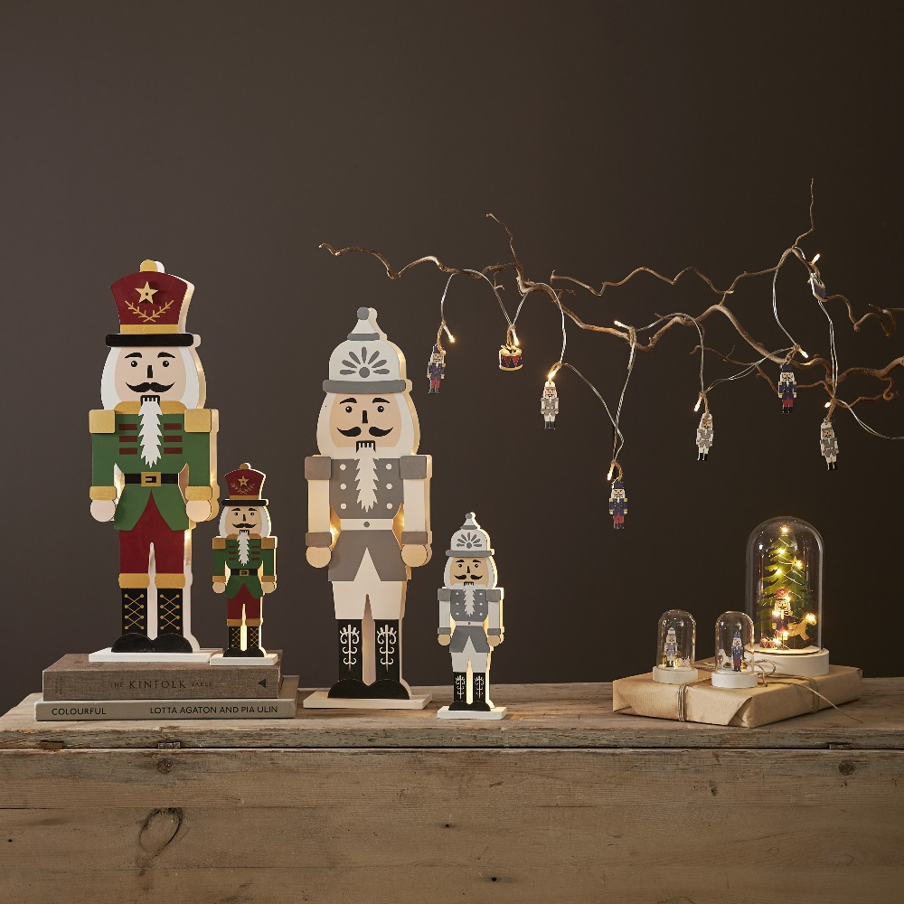 Dwie drewniane figurki dziadka do orzechów z podświetleniem LED, ustawione na drewnianym blacie obok roślin i orzechów. Ciepłe światło buduje przytulną, świąteczną aranżację.