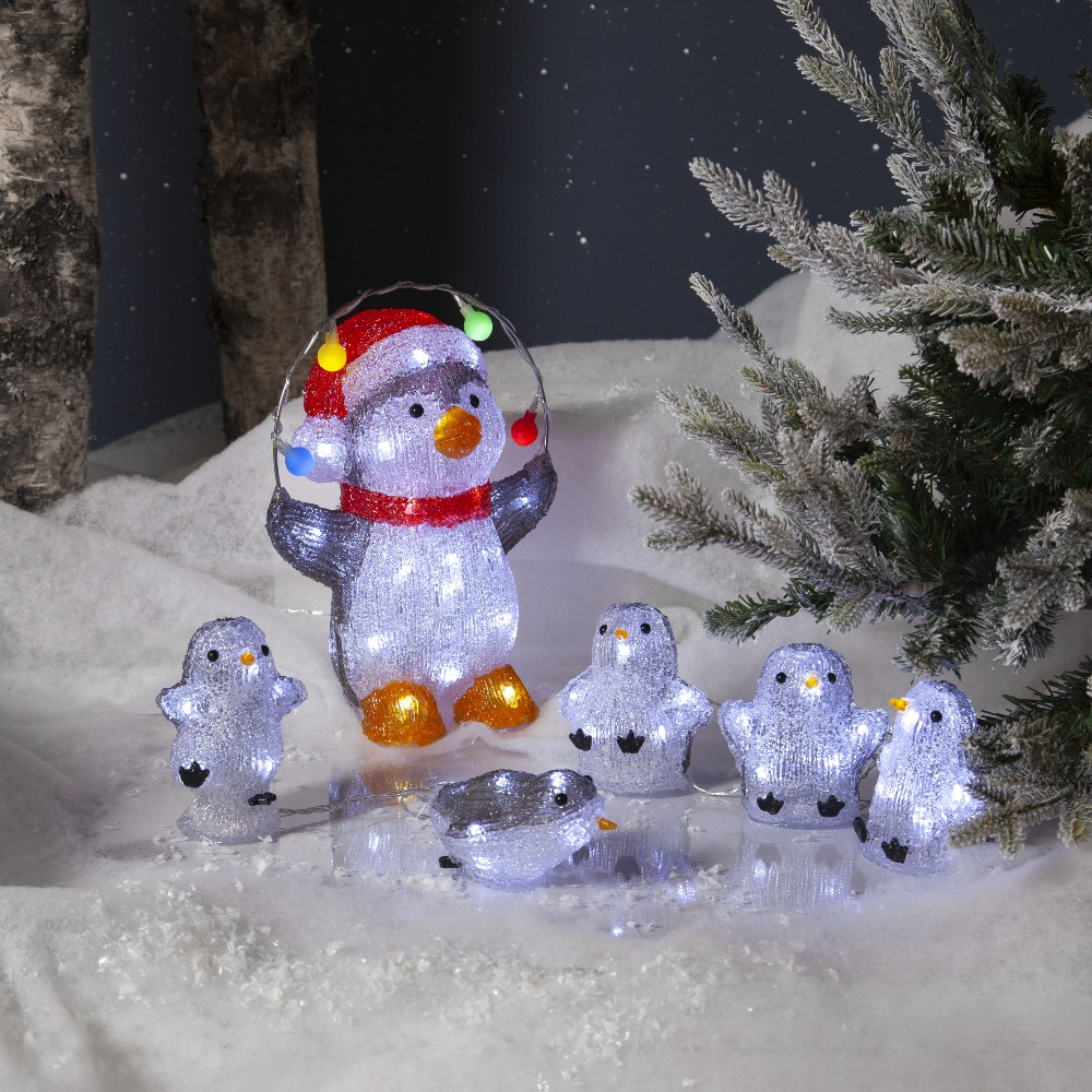 Dekoracja LED w kształcie pingwina w czerwonej czapce, trzymającego girlandę z kolorowymi lampkami, ustawiona na jasnym podłożu imitującym śnieg, w otoczeniu iglastych gałęzi i zimowej scenografii.