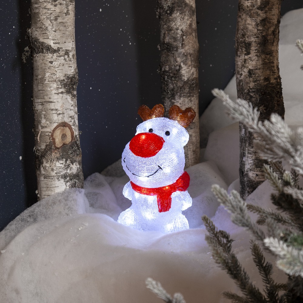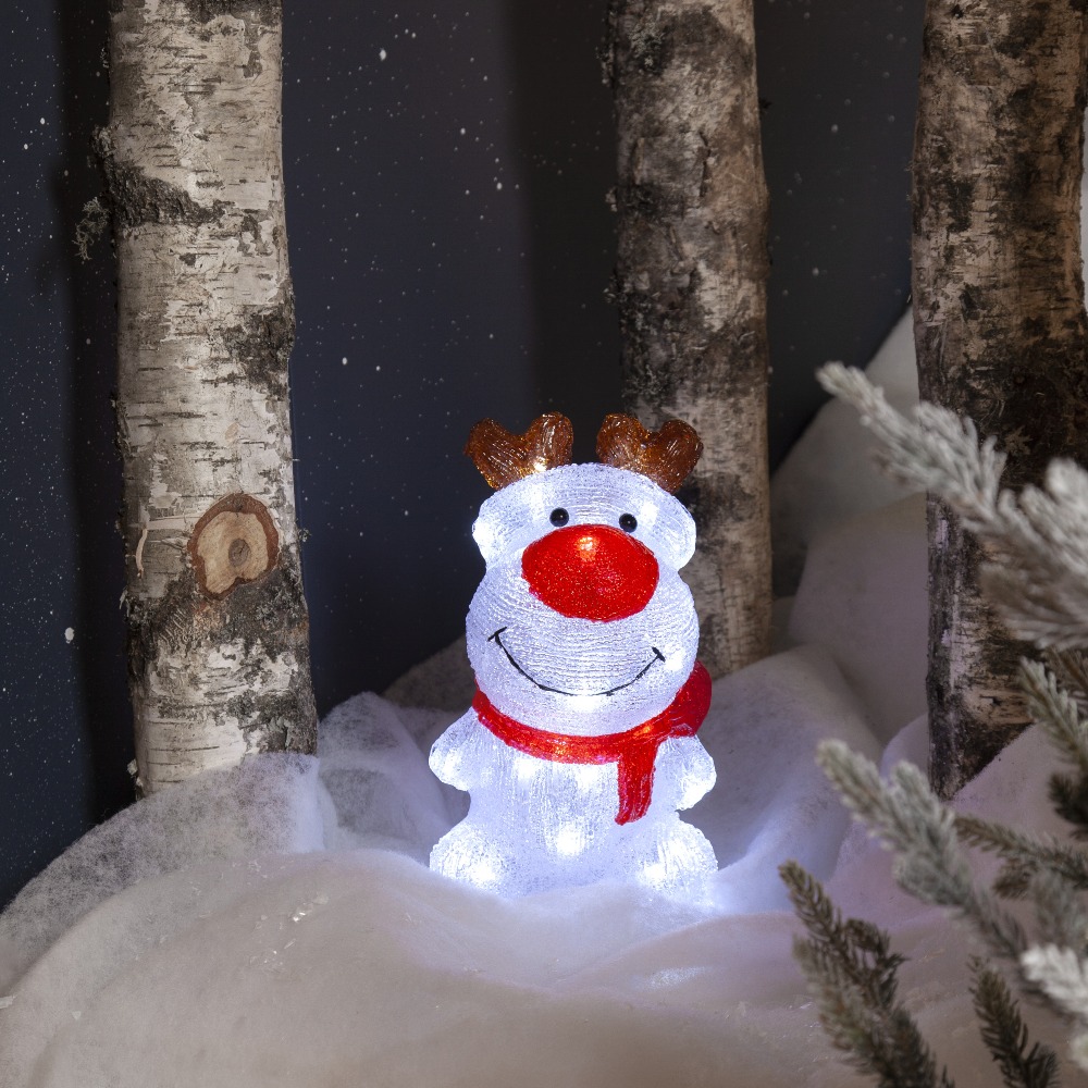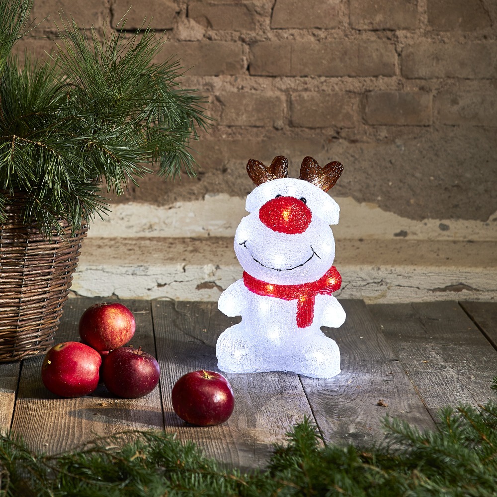 Dekoracyjna figurka w kształcie renifera z czerwonym nosem i szalikiem to uroczy akcent, który doda radości każdej zimowej aranżacji. Dzięki kompaktowej formie i subtelnemu oświetleniu LED doskonale sprawdzi się zarówno we wnętrzach, jak i na zewnątrz — na przykład przy drzwiach wejściowych, na parapecie lub w ogrodzie.