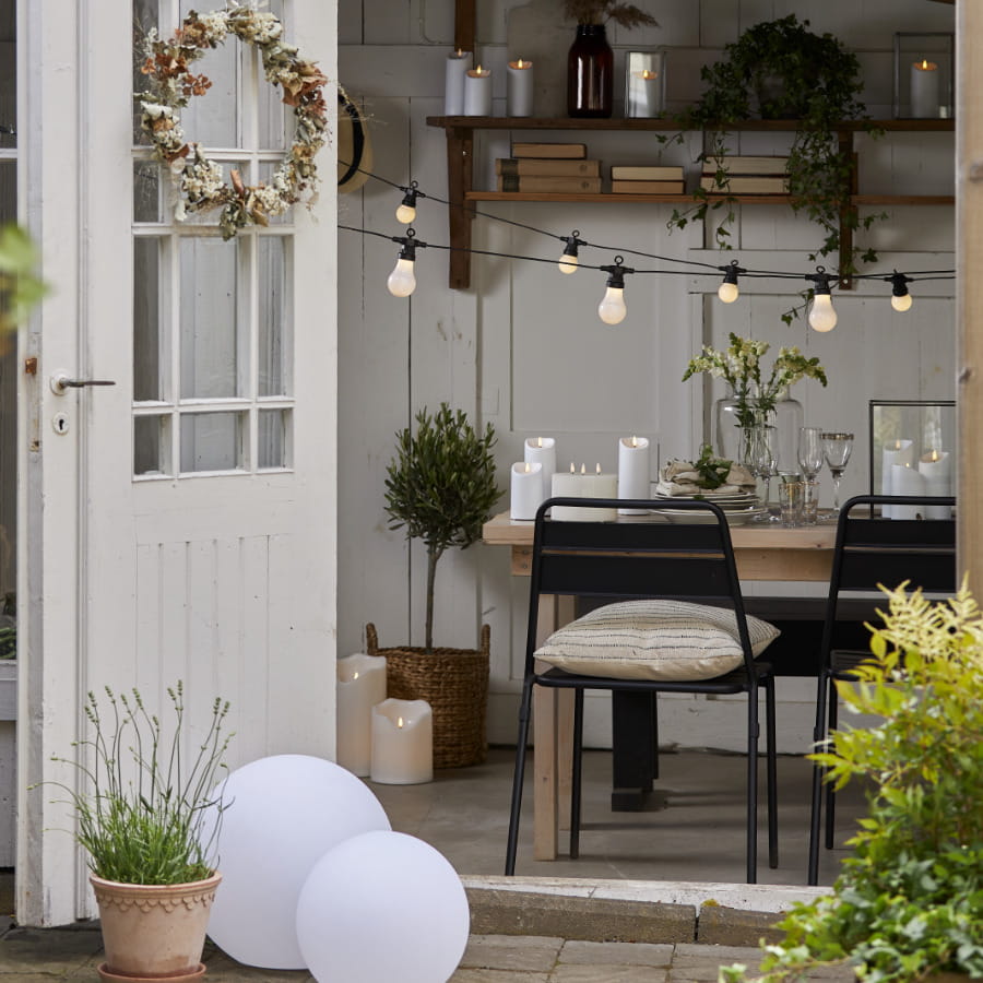 Girlanda LED z mlecznymi kloszami zawieszona nad stołem ogrodowym, tworząca przytulne oświetlenie tarasu w zielonej aranżacji ogrodu.