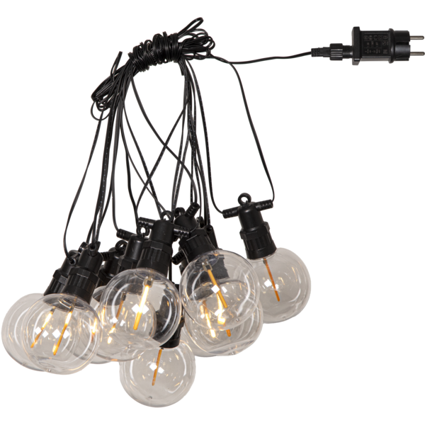 Zestaw girlandy LED z 10 przezroczystymi kloszami typu filament, czarny przewód i wtyczka sieciowa, produkt zaprezentowany na czarnym tle.