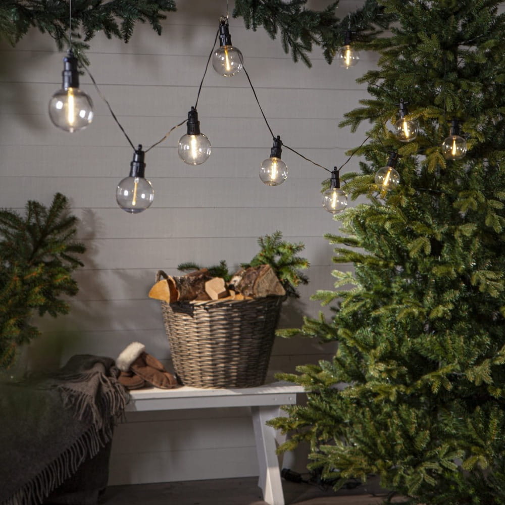 Girlanda LED z przezroczystymi żarówkami filament rozwieszona w aranżacji świątecznej z choinkami, ciepłe białe światło do dekoracji wnętrz i tarasu.