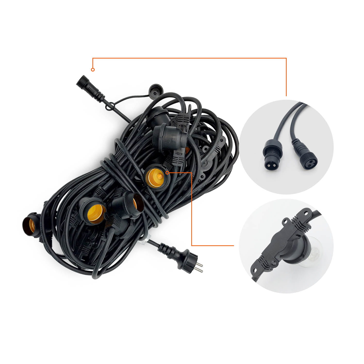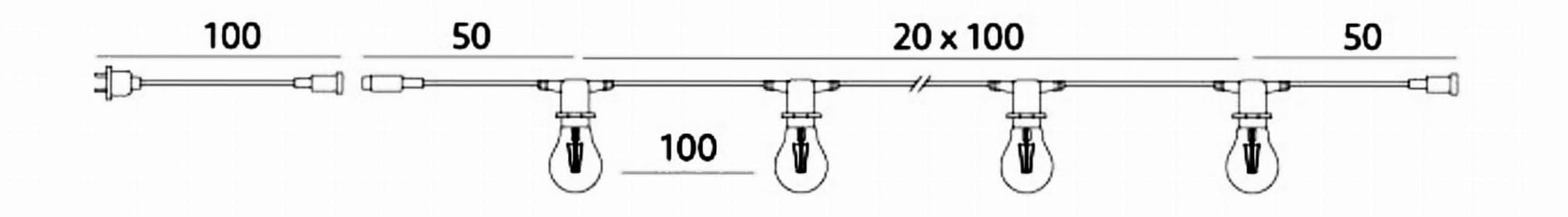 Girlanda modułowa – swoboda konfiguracji - girlanda o długości 20 m wyposażona jest w 20 oprawek E27 (rozstaw co 1 m). Dzięki systemowi modułowemu możliwe jest łatwe łączenie kilku odcinków w jedną dłuższą linię – aż do maksymalnego obciążenia 2000W.