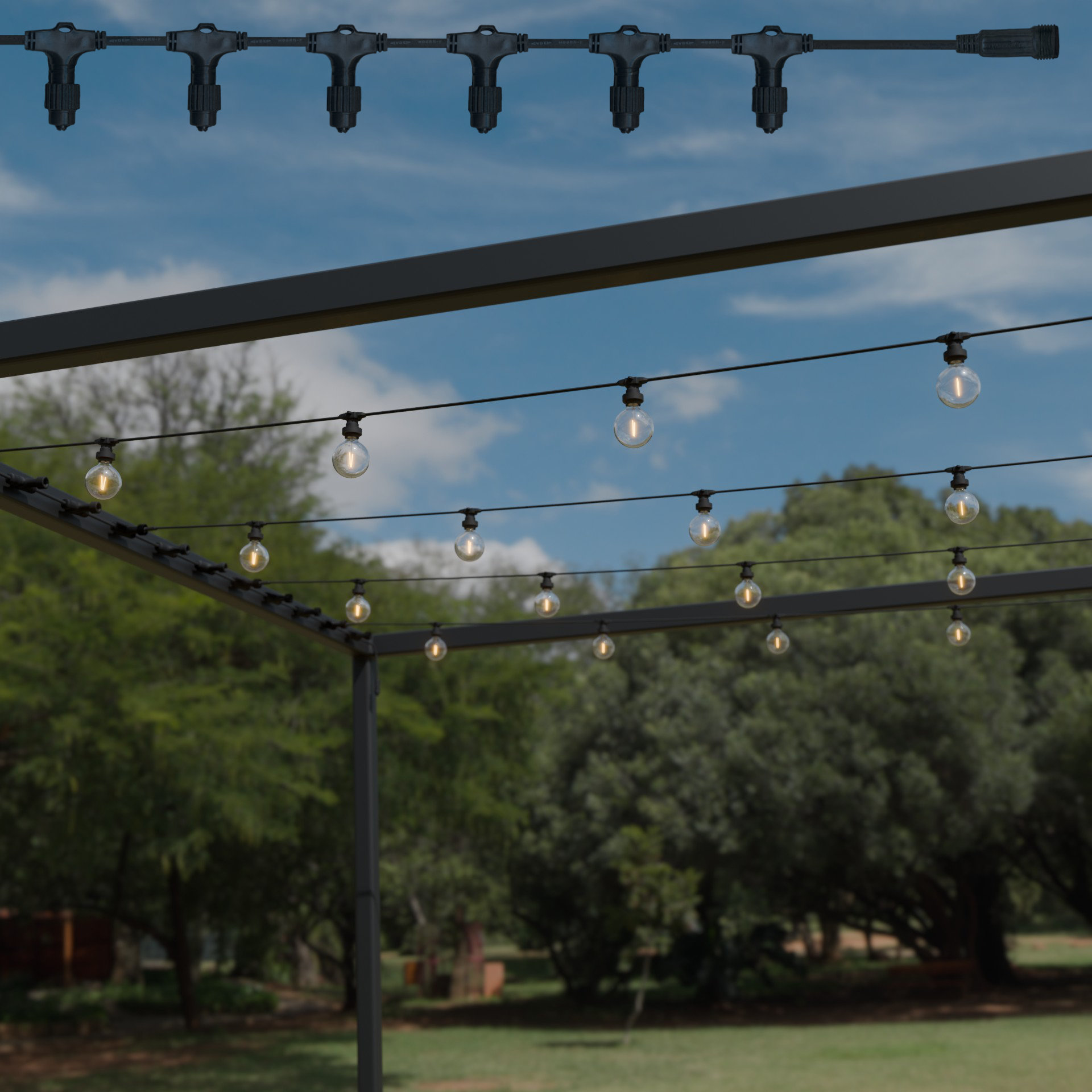 System modułowy – elastyczność i bezpieczeństwo - girlanda CONNECTA została zaprojektowana do pracy w systemie modułowym, umożliwiając łączenie wielu odcinków w jedną instalację oraz zastosowanie rozdzielaczy i trójników. Całość może bezpiecznie obsługiwać obciążenie do 2000W, co sprawia, że system doskonale sprawdza się w zastosowaniach profesjonalnych i intensywnej eksploatacji na zewnątrz.
