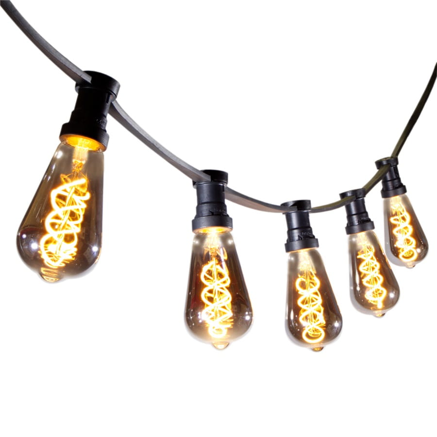 W zestawie znajdują się niezwykle dekoracyjne żarówki LED ST64 o mocy 2W z serii DECOLED SMOKE – pochodzące od znanej szwedzkiej marki. Charakteryzują się spiralnym żarnikiem LED i przydymionym szkłem w stylu retro, który idealnie komponuje się z aranżacjami ogrodowymi, eventowymi i restauracyjnymi. Bardzo ciepła barwa światła 1800K oraz możliwość ściemniania (przy zastosowaniu odpowiedniego ściemniacza LED) sprawiają, że uzyskasz dokładnie taki klimat, jakiego potrzebujesz – od przytulnego wieczoru na tarasie po nastrojowe wesele w plenerze.
