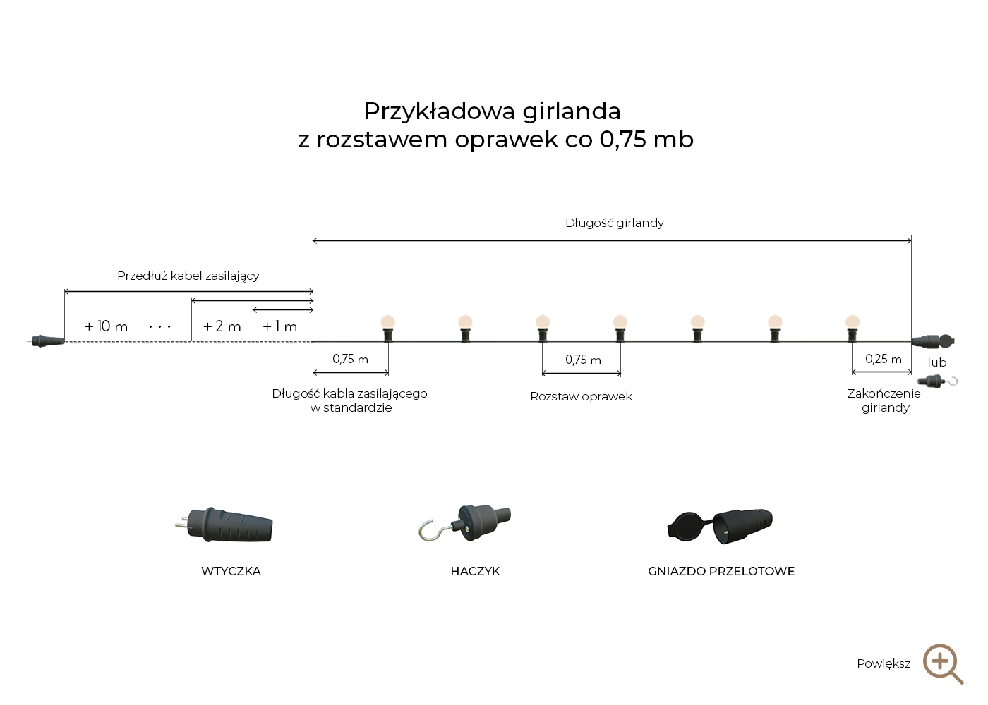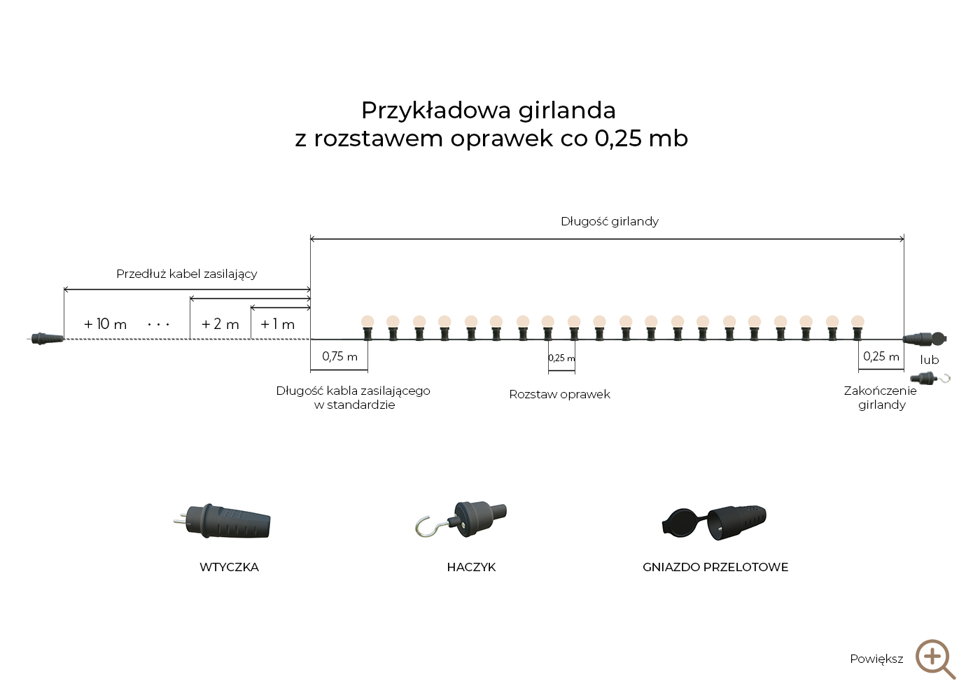 Kabel zasilający, czyli odległość od wtyczki do pierwszej żarówki. Każda girlanda na wymiar standardowo ma 0,75m zasilania, ten krok daje możliwość modyfikacji tej długości. Opcja -0,5 lub -0,25m skraca długość zasilania, dzięki czemu możemy uzyskać równe odstępy podczas łączenia girland.