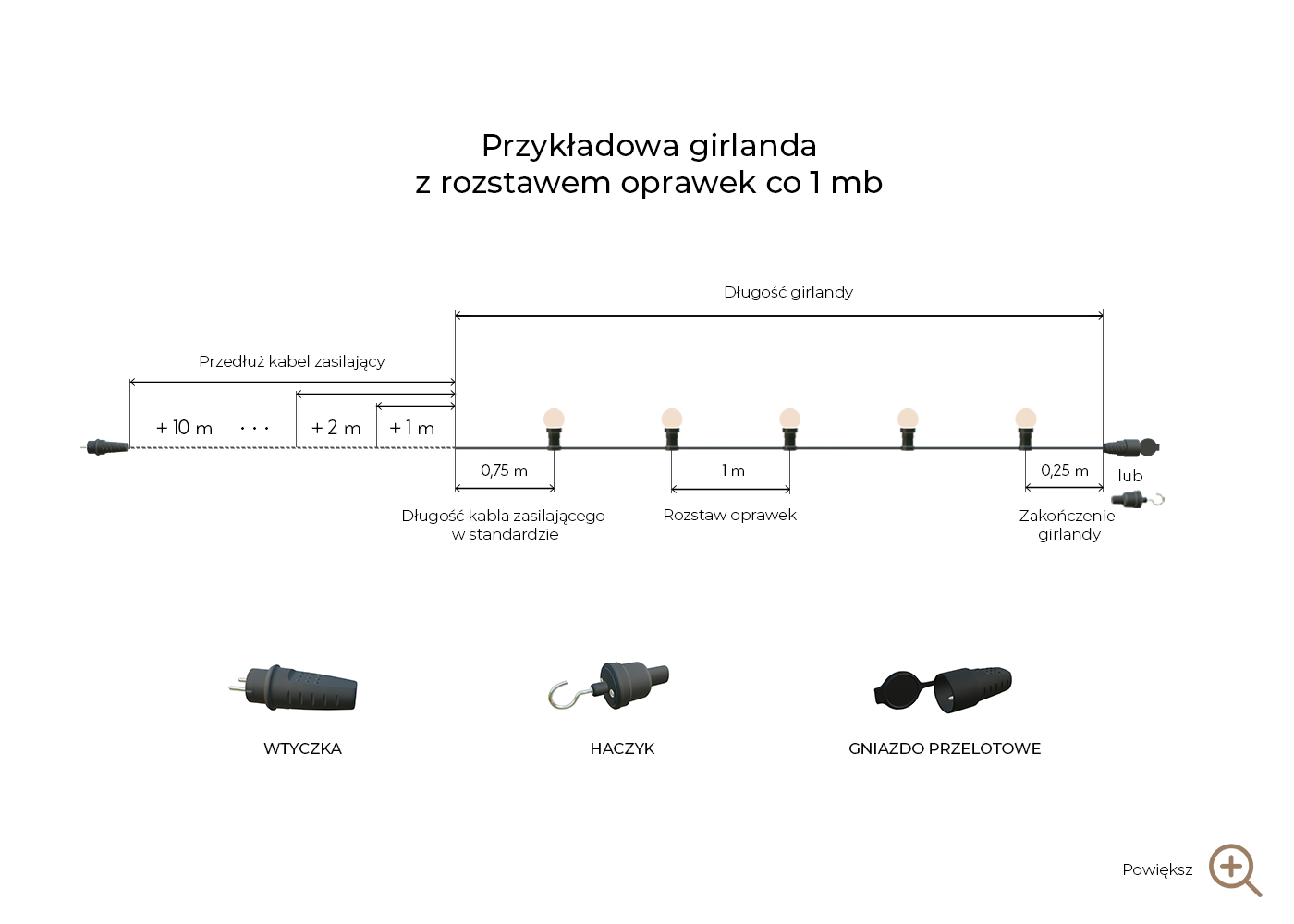 Kabel zasilający, czyli odległość od wtyczki do pierwszej żarówki. Każda girlanda na wymiar standardowo ma 0,75m zasilania, ten krok daje możliwość modyfikacji tej długości. Opcja -0,5 lub -0,25m skraca długość zasilania, dzięki czemu możemy uzyskać równe odstępy podczas łączenia girland.
