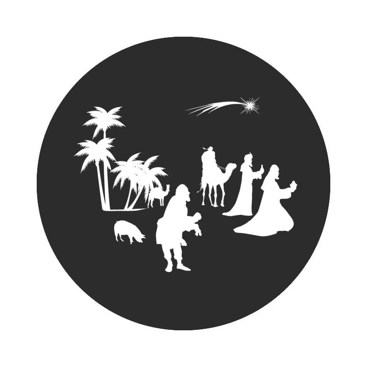 Efekt statyczny świąteczny z motywem religijnym. Gobos dostępny w trzech rozmiarach: 70 mm pasujący do projektorów PROIETTA IMPRESSIVE i THOROK, 50 mm pasujący do projektorów PHOSE i 37,3 mm pasujący do projektorów IRIDIUM i DIAMOND. Czarne tło przedstawione na grafice jest tylko przysłoną dla strumienia światła i nie widoczne podczas projekcji