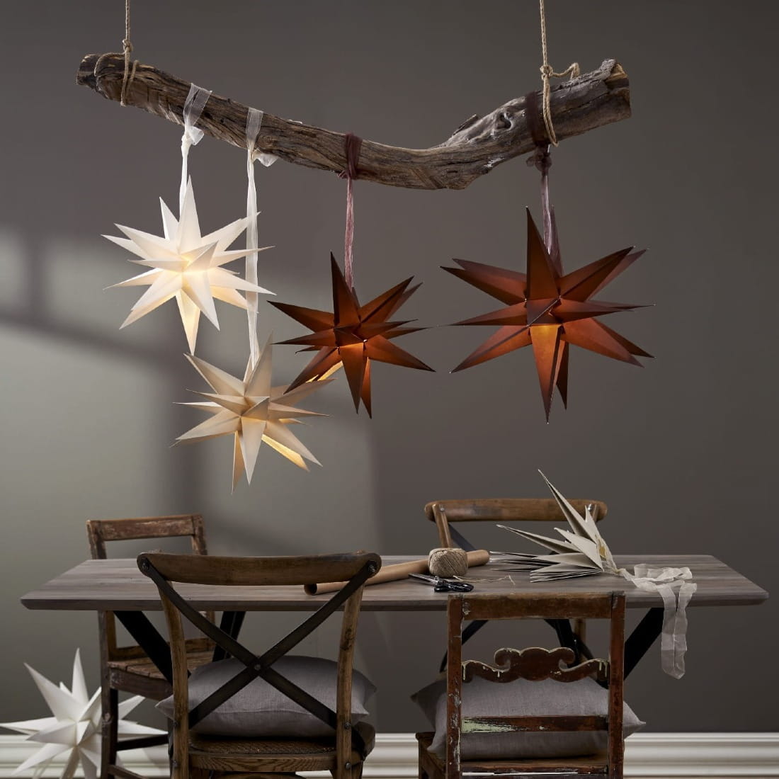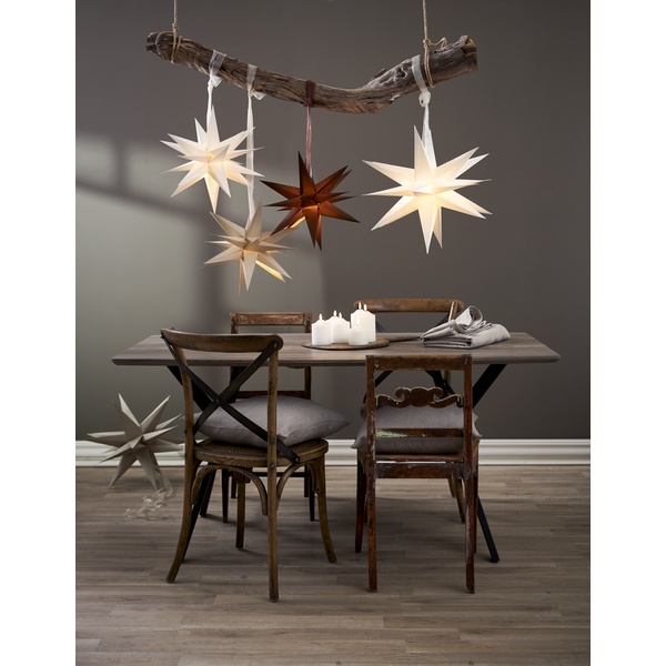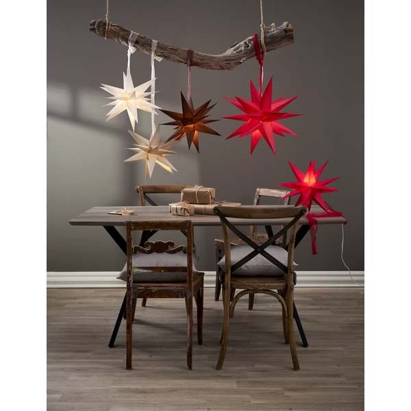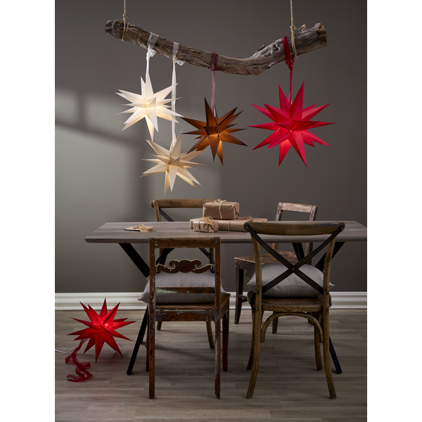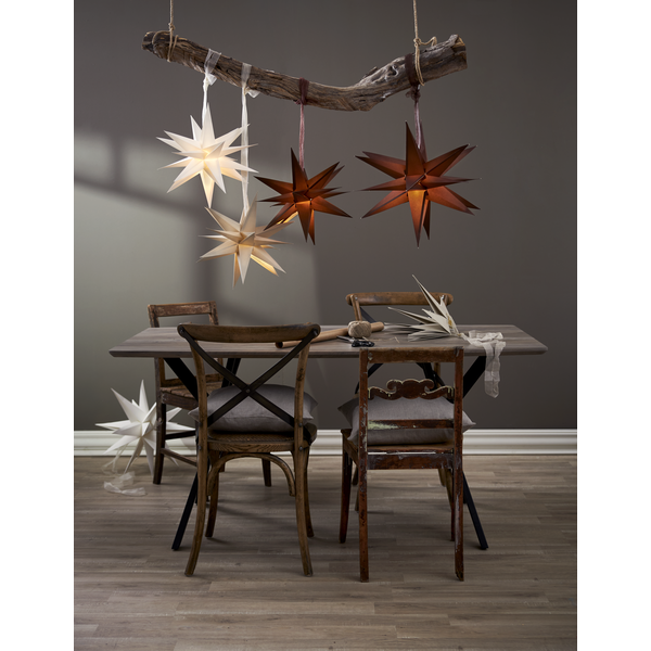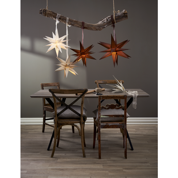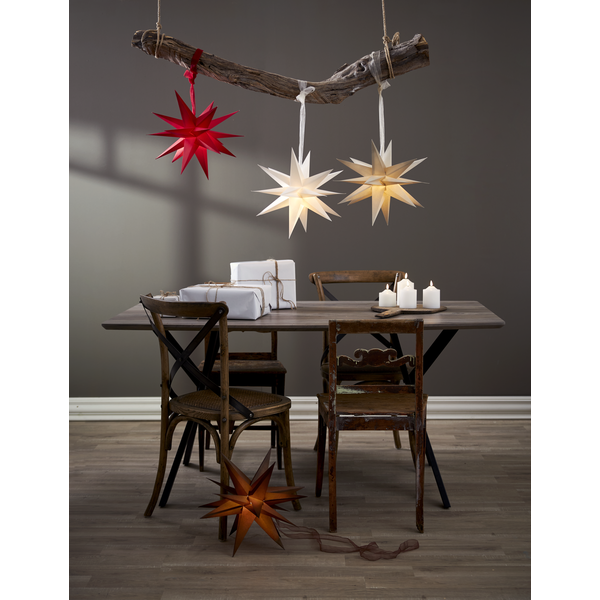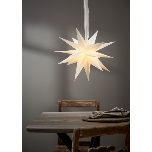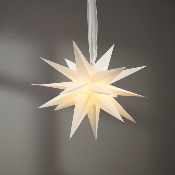Biała gwiazda o średnicy 43 cm, składająca się z 18 precyzyjnie wykonanych ramion, to subtelna i elegancka dekoracja, która rozjaśni każde wnętrze świątecznym blaskiem. Trójwymiarowa forma i klasyczny kolor sprawiają, że gwiazda pięknie prezentuje się zarówno w oknie, jak i nad stołem lub w centralnym punkcie salonu. Łatwy montaż umożliwia ozdobna wstążka oraz sznurek ściągający, a do gwiazdy można dobrać dowolny zestaw kabli i źródło światła, które nie są dołączone do zestawu.