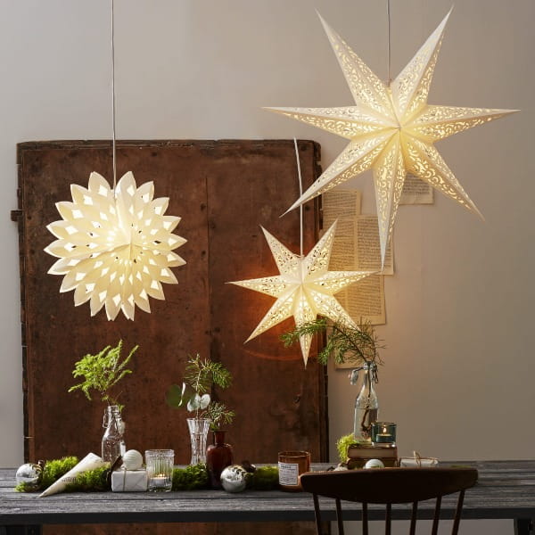 Biała gwiazda o średnicy 60 cm to elegancka dekoracja, która swoim geometrycznym wzorem przypomina delikatny płatek śniegu. Jej starannie wycięta forma wnosi nowoczesny i subtelny akcent do wnętrza, doskonale rozpraszając światło i tworząc przytulną, harmonijną atmosferę. Dzięki uniwersalnemu designowi świetnie sprawdzi się zarówno w oknie, na ścianie, jak i jako centralny element dekoracyjny w dowolnym pomieszczeniu. Jasna kolorystyka i lekka konstrukcja sprawiają, że gwiazda pięknie komponuje się z wieloma stylami aranżacyjnymi.