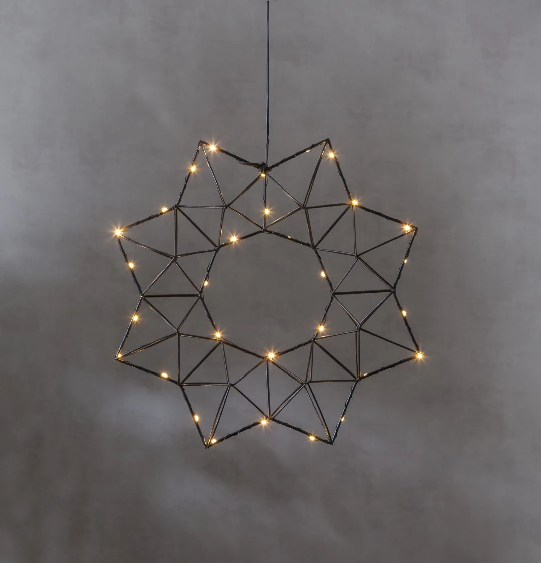 Czarna dekoracja o średnicy 40 cm to nowoczesny i stylowy akcent, który doskonale podkreśli charakter każdego wnętrza. Wyrazista, geometryczna forma przyciąga wzrok, a delikatne diody LED DEW DROP otulają dekorację ciepłym światłem, tworząc wyjątkowy, przytulny nastrój podczas wieczorów. Ozdoba świetnie prezentuje się zarówno jako samodzielny element, jak i w połączeniu z innymi dekoracjami.