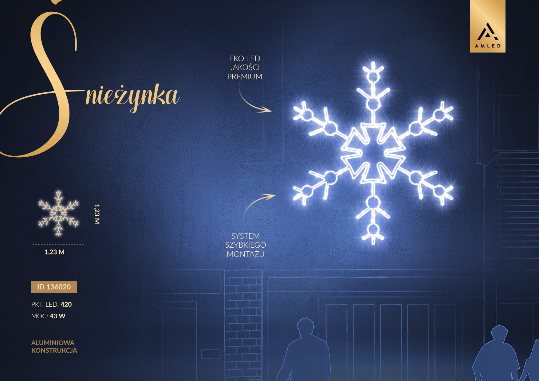 Śnieżynka o średnicy 123 cm to świąteczny akcent o nowoczesnym i dynamicznym wyglądzie, który doskonale sprawdza się w przestrzeniach miejskich, na elewacjach budynków komercyjnych oraz wzdłuż ulic i placów. Ozdoba została wykonana z aluminium i wyposażona w 420 punktów LED, które zapewniają wyrazisty, równomierny blask. Dzięki kulistym detalom na końcach ramion śnieżynka zyskuje charakterystyczny wygląd, który wyróżnia ją wśród innych dekoracji świetlnych. Zintegrowany system montażowy SYSTEM PRO umożliwia szybkie łączenie jej z innymi elementami iluminacji.