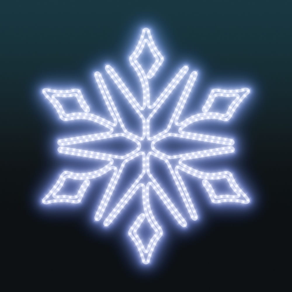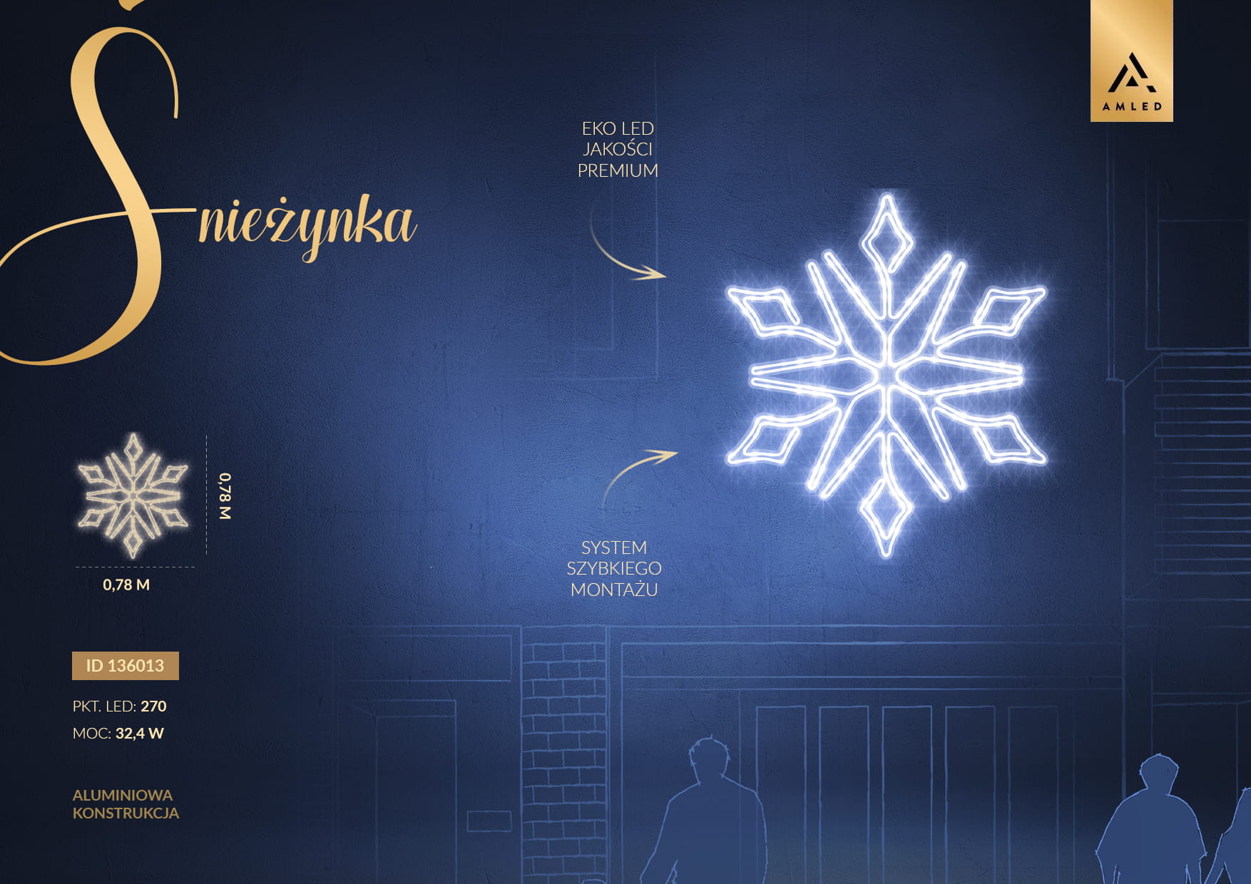 Śnieżynka o średnicy 78 cm to elegancki element świetlny, który wprowadza zimową atmosferę na fasadach budynków, hoteli, witryn sklepowych czy miejskich ulic. Dzięki precyzyjnemu wzorowi i zastosowaniu aż 270 punktów LED, dekoracja efektownie prezentuje się zarówno z bliska, jak i z większej odległości. Aluminiowa, lekka konstrukcja zapewnia łatwy montaż, a system szybkiego łączenia SYSTEM PRO pozwala na tworzenie rozbudowanych iluminacji z kurtynami i sznurami świetlnymi.