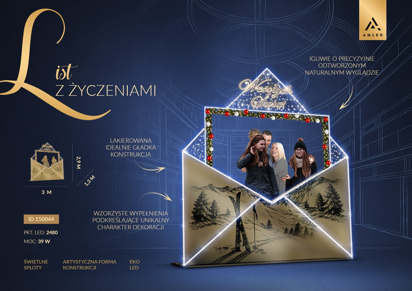 Dekoracja świąteczna w formie otwartej koperty to nietuzinkowy fotopunkt, który przyciąga uwagę eleganckim wykończeniem i klimatycznym charakterem. W centralnej części znajduje się miejsce do zdjęć, obramowane girlandą z igliwia i świetlnym napisem „Wesołych Świąt”. U podstawy dekoracji widoczna jest malarska grafika z górskim krajobrazem oraz motywami nart, która dodaje całości unikalnego uroku. Dekoracja świetnie sprawdzi się jako przestrzenna instalacja w galeriach handlowych, na miejskich placach lub deptakach, zachęcając przechodniów do świątecznych zdjęć.