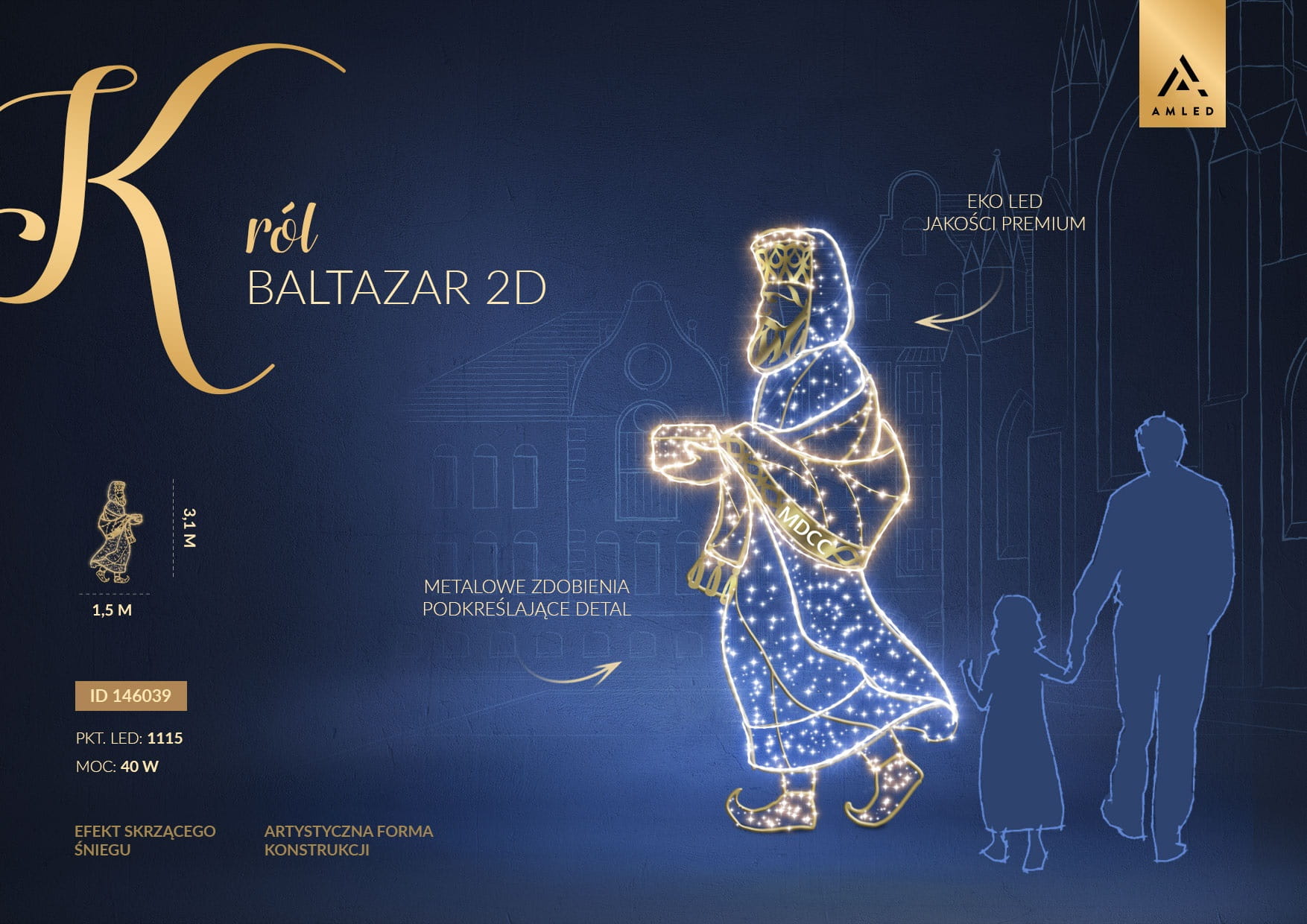 Infografika iluminacji LED Król Baltazar 2D – dekoracja świąteczna o wysokości 3,1 m i szerokości 1,5 m, postać jednego z Trzech Króli w złotych szatach, rozświetlona 1115 punktami LED z efektem skrzącego śniegu.