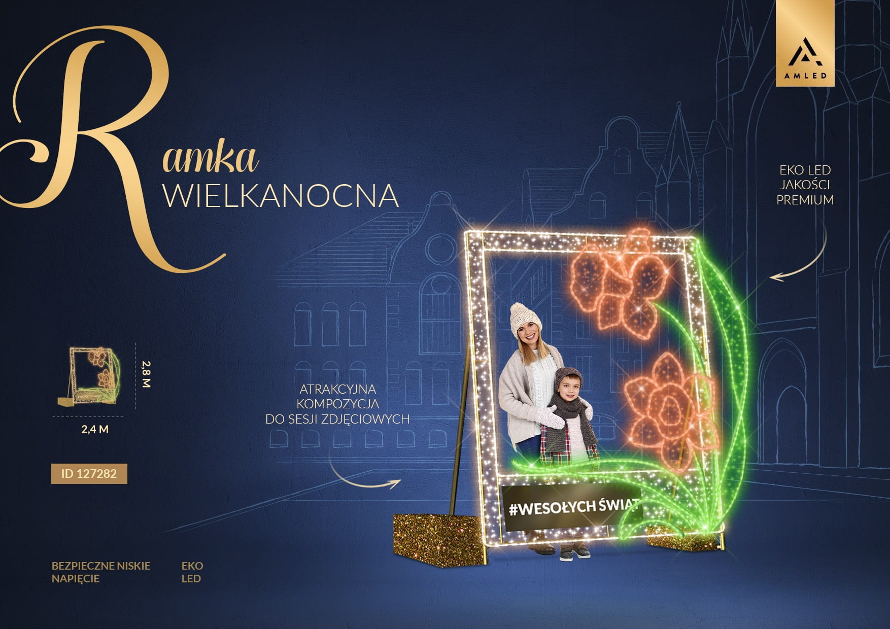 Fotorama Wielkanocna to wyjątkowa wolnostojąca dekoracja, która łączy świąteczny urok z funkcjonalnością idealnego punktu fotograficznego. Dzięki efektownemu podświetleniu LED i eleganckiej kompozycji, stanowi atrakcyjny element wielkanocnej aranżacji, przyciągając mieszkańców i turystów. Zaprojektowana z myślą o interakcji, fotorama zachęca do robienia pamiątkowych zdjęć, które stają się chętnie udostępniane w mediach społecznościowych, promując przestrzeń, w której się znajduje. Fotorama Wielkanocna to więcej niż dekoracja – to interaktywna atrakcja, która przyciąga uwagę, zachęca do zabawy i tworzy wyjątkową atmosferę świąt!
