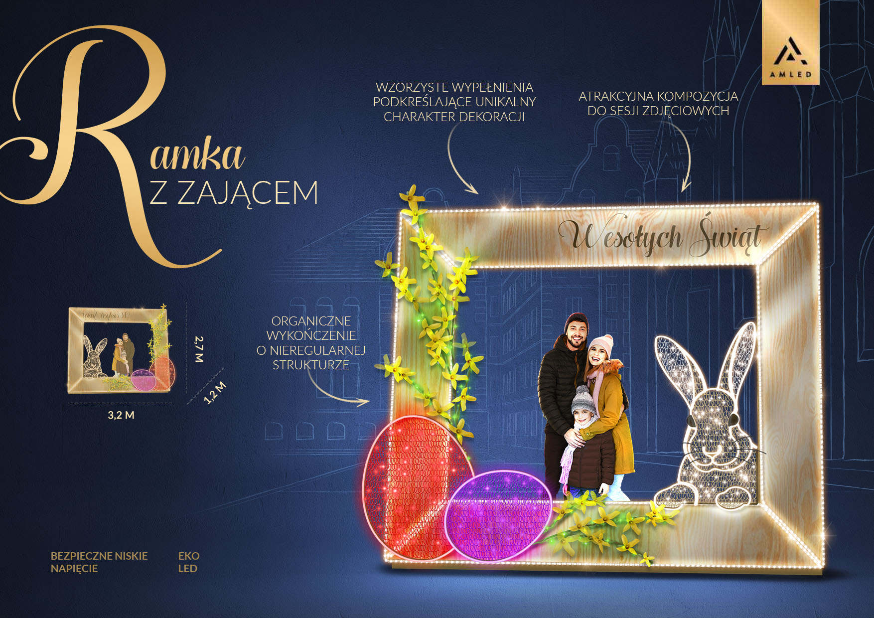 Ramka z Zającem 2D to efektowny, wielkanocny fotopunkt zaprojektowany z myślą o przestrzeniach miejskich, galeriach handlowych oraz wydarzeniach sezonowych. Dekoracja łączy świąteczne motywy z nowoczesnym podświetleniem LED, tworząc atrakcyjne tło do zdjęć i przyciągając uwagę zarówno dzieci, jak i dorosłych. Ramka z Zającem 2D to dekoracja, która buduje świąteczną atmosferę i staje się naturalnym miejscem spotkań oraz pamiątkowych zdjęć w okresie wielkanocnym.
