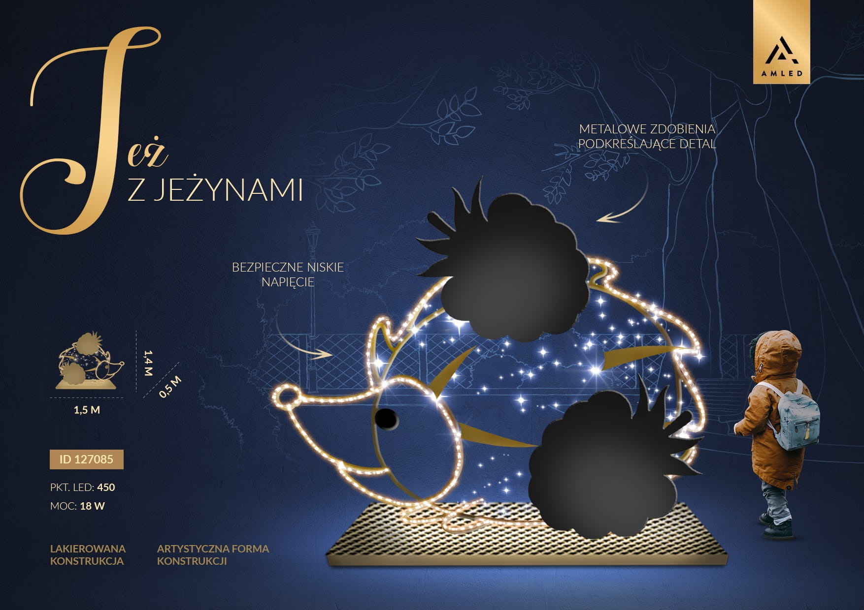 Jeż LED z jeżynami dekoracja świetlna 3D do parków i przestrzeni miejskich z ciepłym białym oświetleniem, metalowymi detalami i efektem świetlnych punktów, bezpieczne niskie napięcie, atrakcyjna iluminacja dla rodzin i dzieci. ID 127085.