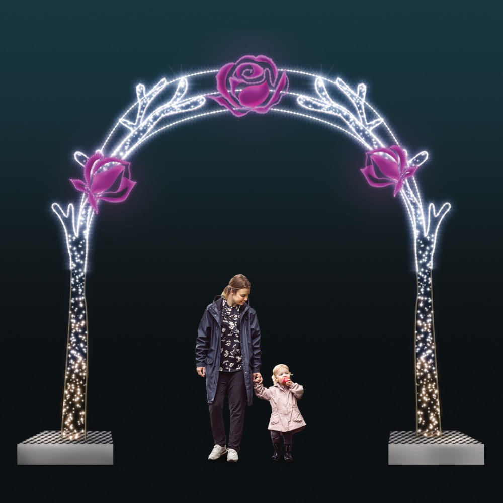 Subtelna symbolika i wizualna harmonia - pergola Różana zachwyca swoim kunsztownym wykonaniem – precyzyjne metalowe zdobienia oraz artystyczna forma konstrukcji tworzą niepowtarzalną kompozycję świetlną. Róże w intensywnym różowym odcieniu kontrastują z białym światłem, dodając dekoracji głębi i wyrazistości.