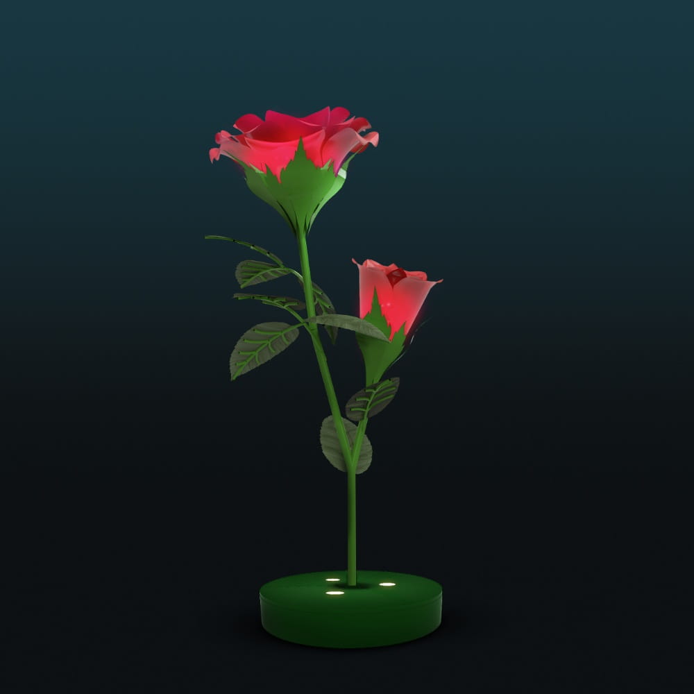 Dekoracja świetlna LED w formie róż na ciemnym tle, nowoczesny element 3D z podświetlanymi płatkami i zieloną konstrukcją, przeznaczony do parków, alejek i przestrzeni miejskich oraz instalacji plenerowych.