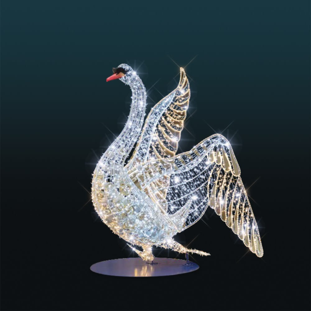 Idealny element dekoracyjny i fotopunkt - ta imponująca iluminacja nie tylko przyciąga spojrzenia, ale także tworzy doskonałe tło do pamiątkowych zdjęć. Dzięki swojej elegancji i detalom, świetlisty łabędź dodaje splendoru każdej przestrzeni – od miejskich skwerów po luksusowe galerie handlowe.