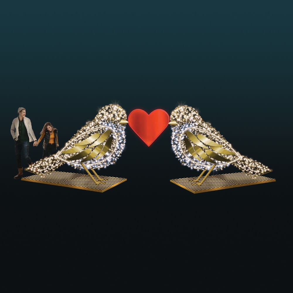 Zakochane Wróbelki 3D to wyjątkowa dekoracja świetlna, która w subtelny i symboliczny sposób opowiada historię bliskości. Dwie złote sylwetki ptaków zwrócone ku sobie, połączone czerwonym sercem, tworzą ciepłą i przyjazną kompozycję, idealną do przestrzeni miejskich, parków, deptaków oraz stref spacerowych. To dekoracja, która naturalnie przyciąga spojrzenia i zachęca do zatrzymania się na chwilę.