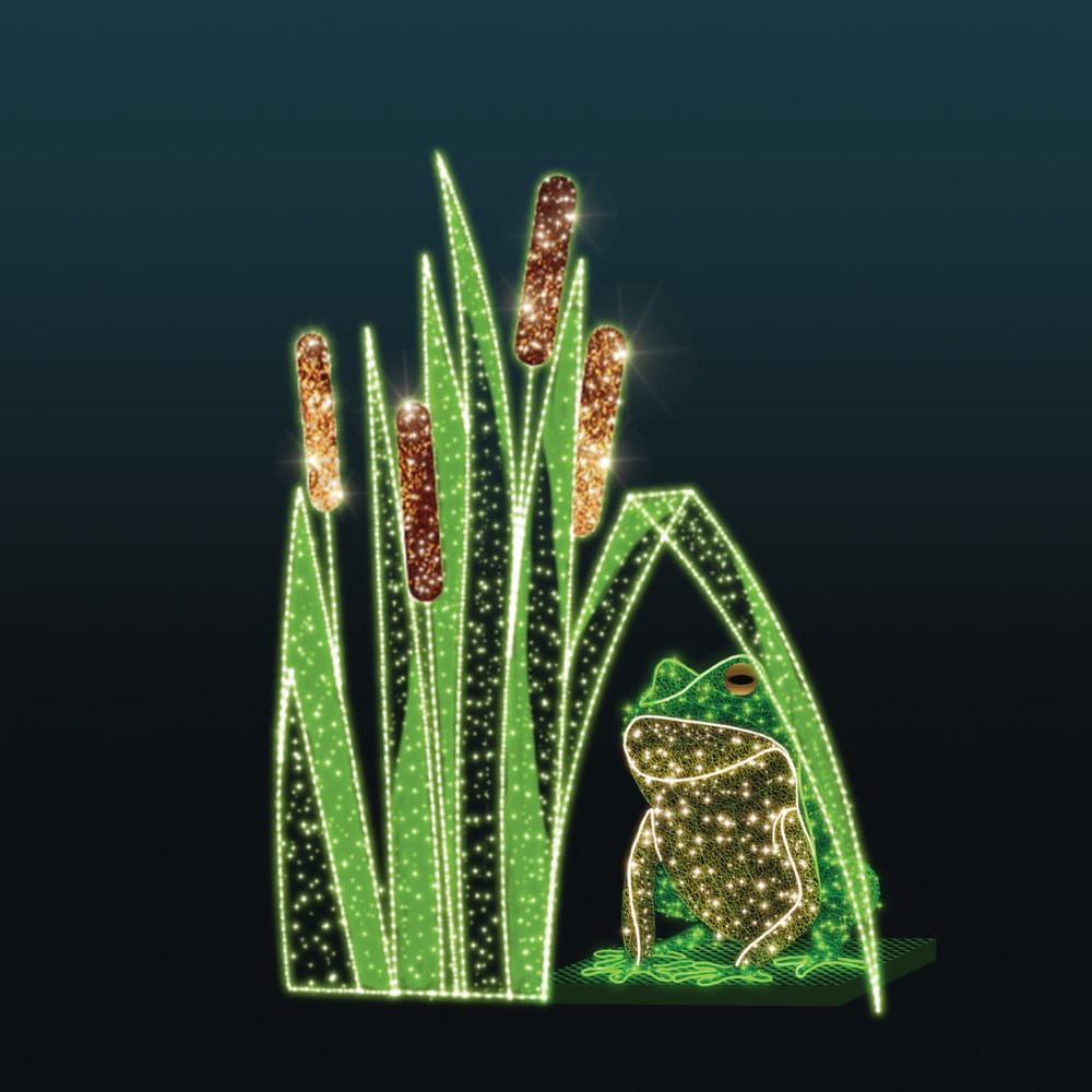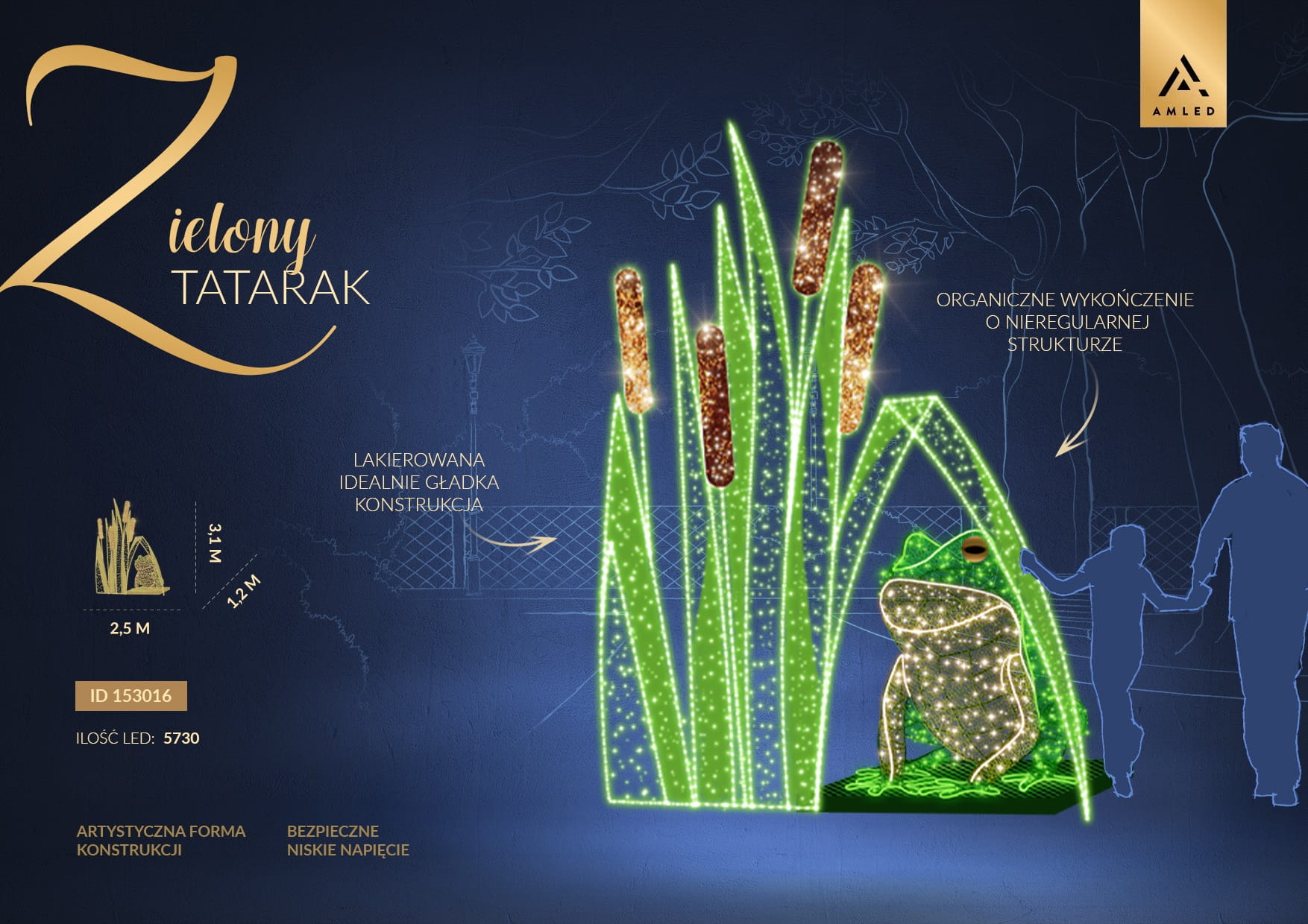 Zielony Tatarak to oryginalna iluminacja, która łączy botaniczną estetykę z nowoczesną technologią LED. Kompozycja z wysokich, świetlnych źdźbeł i realistycznie odwzorowanej żaby przyciąga uwagę i zachwyca bajkowym charakterem. Idealna do parków, bulwarów i ogrodów tematycznych, wnosi do przestrzeni lekkość i świeżość natury.