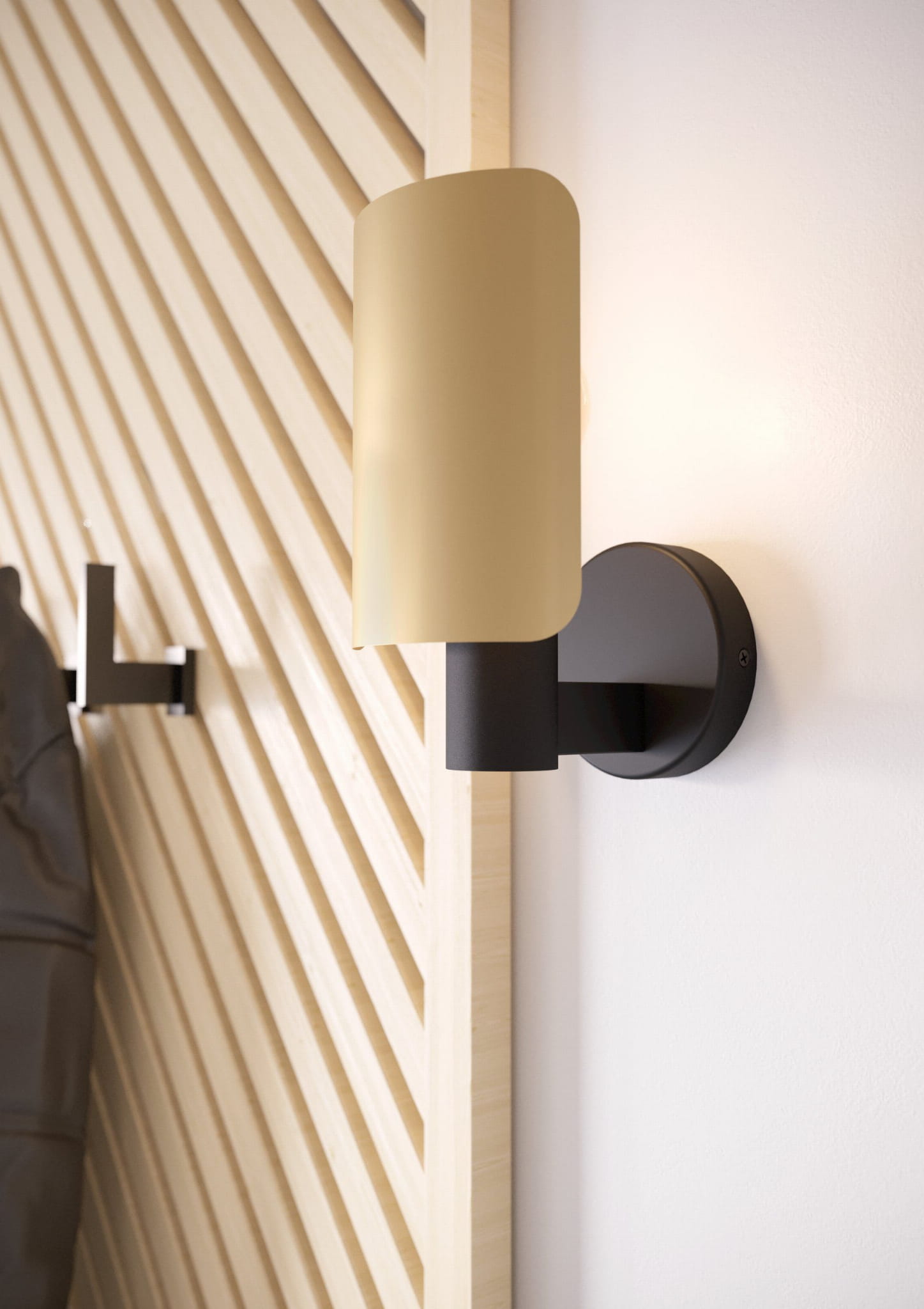 Kinkiet HAYES to stylowa propozycja dla wnętrz, które łączą nowoczesność z nutą elegancji. Czarna oprawa kontrastuje ze złotym wnętrzem klosza, tworząc przyjemne, ciepłe światło i przyciągający wzrok efekt. Doskonale sprawdzi się jako oświetlenie akcentowe przy łóżku, w przedpokoju lub nad ulubionym fotelem. Jego minimalistyczny kształt sprawia, że z łatwością dopasujesz go do wielu aranżacji.
