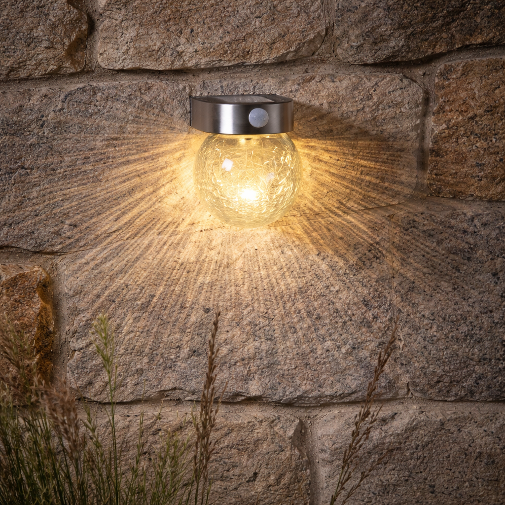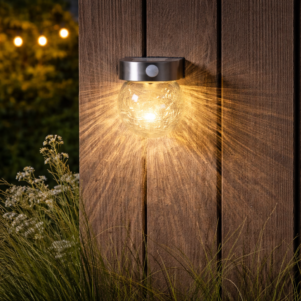 Solarny kinkiet LED z czujnikiem ruchu i szklaną kulą o dekoracyjnej strukturze zapewnia nastrojowe oświetlenie przy wejściu lub na tarasie.