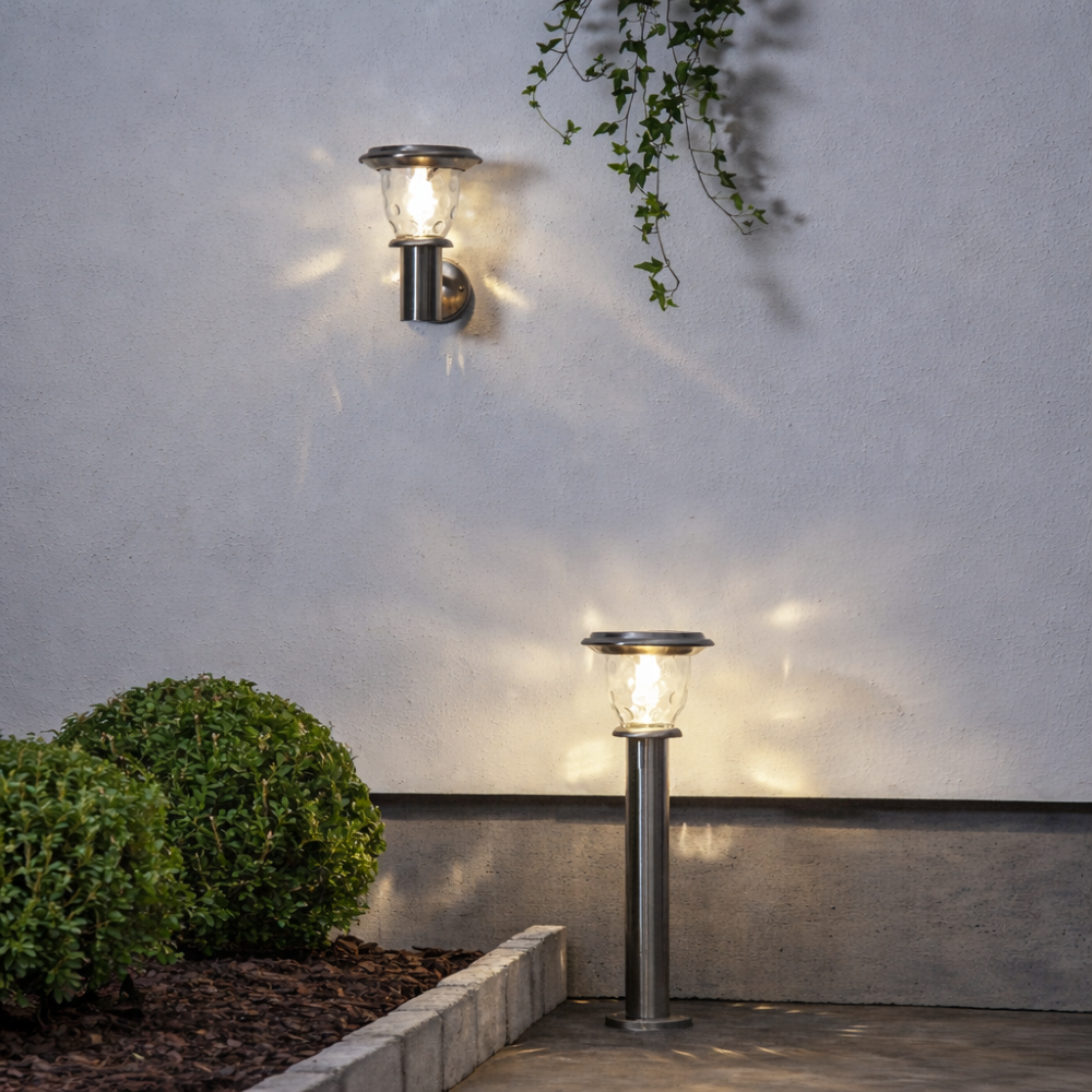 Kinkiet solarny z dekoracyjnym kloszem, emitujący ciepłe, rozproszone światło. Subtelny efekt świetlny tworzy przytulny klimat przy wejściu, na tarasie lub balkonie.