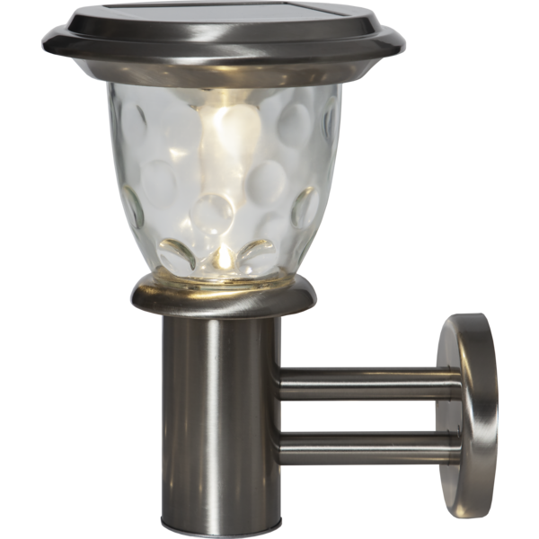 Kinkiet solarny z dekoracyjnym, transparentnym kloszem, który efektownie rozprasza światło LED. Prosta forma i kompaktowy rozmiar sprawiają, że doskonale pasuje do oświetlenia elewacji lub wejścia.