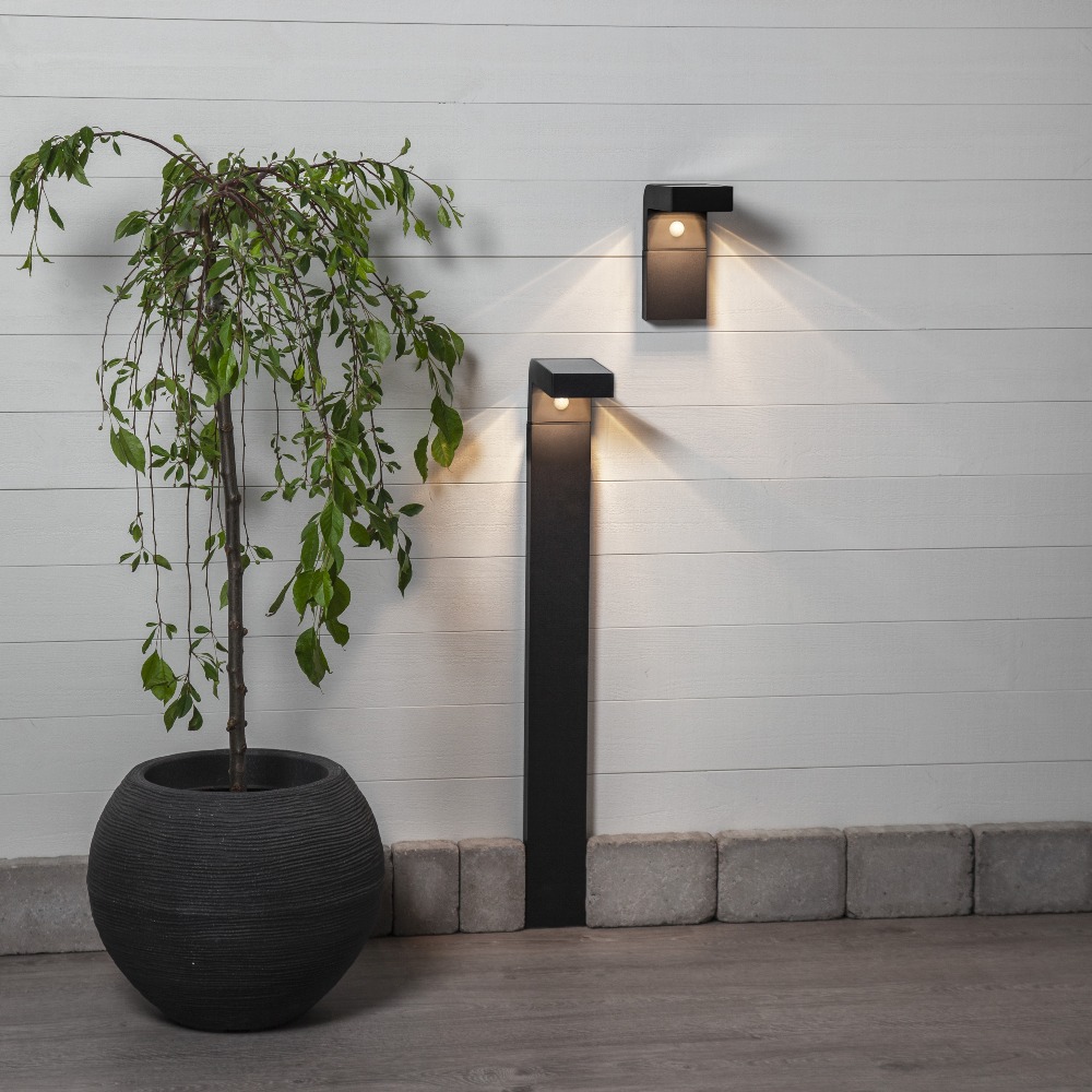 Czarna solarna lampa ogrodowa LED VICI w formie słupka oraz kinkiet ścienny tworzące spójne oświetlenie nowoczesnej przestrzeni przy domu.