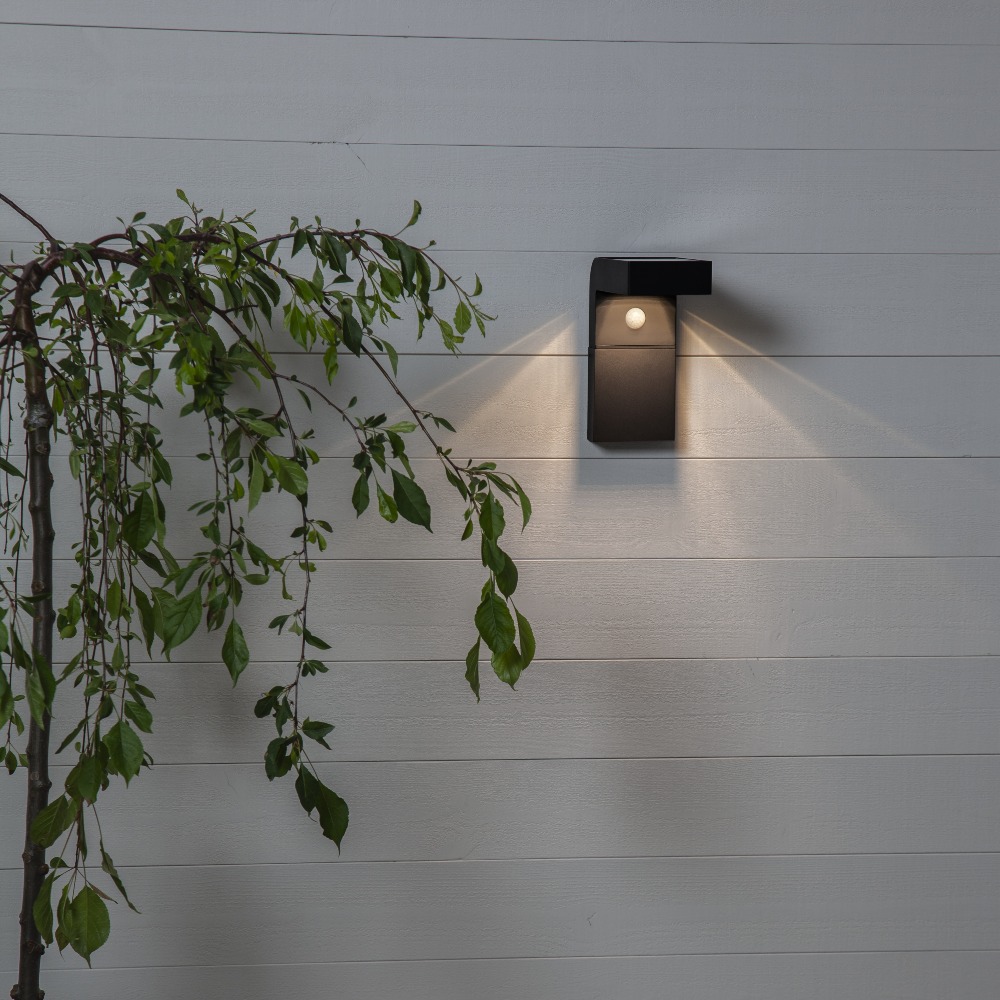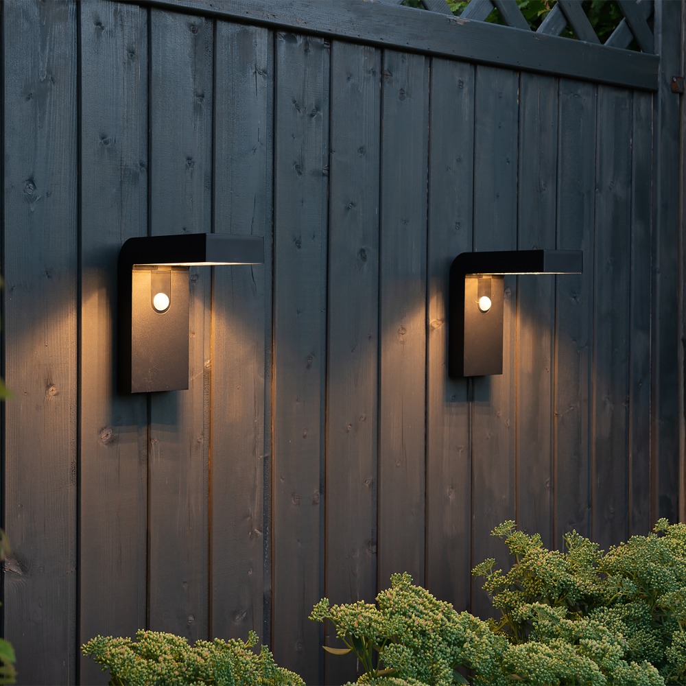 Czarny solarny kinkiet ogrodowy LED VICI z czujnikiem ruchu PIR zamontowany na drewnianej elewacji ciepłe światło oświetlające rośliny przy ścianie.