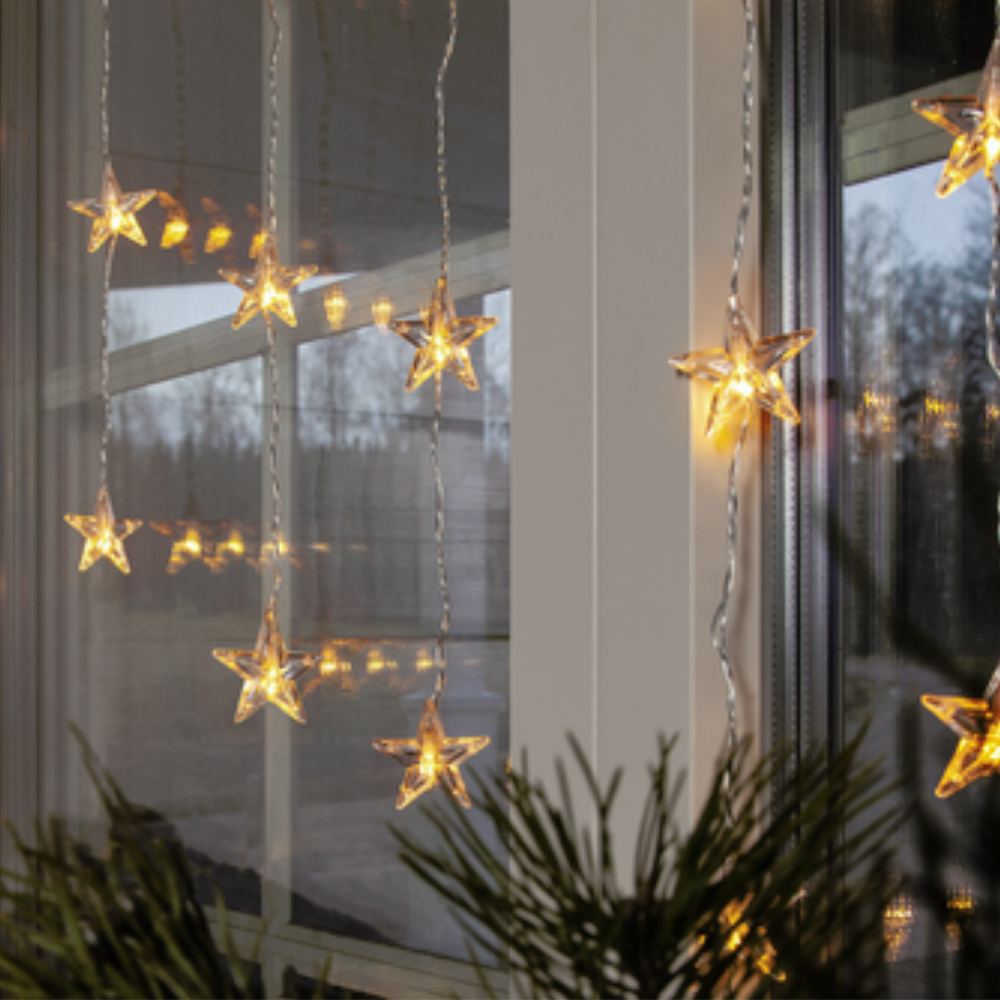 Kurtyna LED z gwiazdkami to dekoracja, która wprowadza do wnętrza przytulny, świąteczny nastrój. Delikatne diody LED roztaczają ciepły blask, tworząc efekt świetlnej kaskady, która pięknie zdobi okna, wnęki lub ściany. Transparentne przewody i subtelne gwiazdki nadają całości lekkości, podkreślając zimową atmosferę.