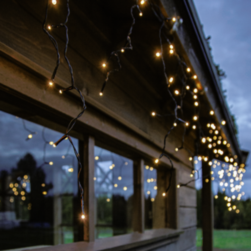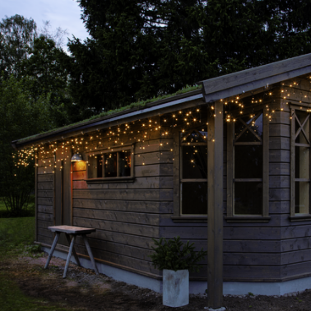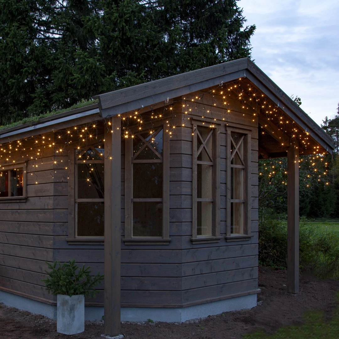 Kurtyna Sople LED zamontowana na drewnianym domku ogrodowym, ciepłe światło 2700 K tworzy nastrojową iluminację na zewnątrz.
