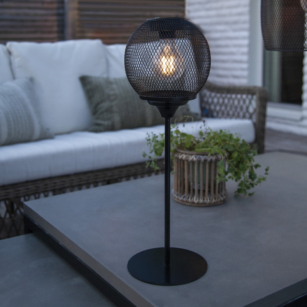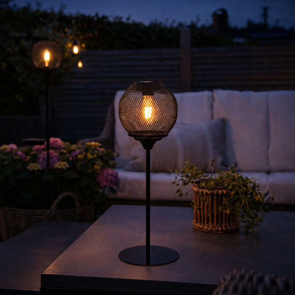 Czarna lampa solarna LED o wysokości 45 cm to stylowe oświetlenie w industrialnym designie, które doskonale sprawdzi się na tarasie, balkonie lub w ogrodzie. Jej metalowa siatkowa konstrukcja otacza żarówkę LED o ciepłej barwie światła, nadając przestrzeni przytulny i elegancki charakter. Po pełnym naładowaniu lampa świeci przez około 5 godzin, zapewniając wyjątkowy efekt świetlny przez cały wieczór.